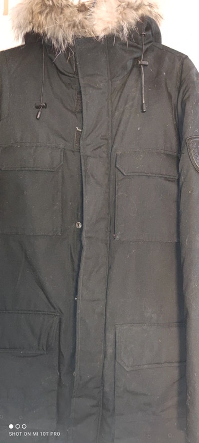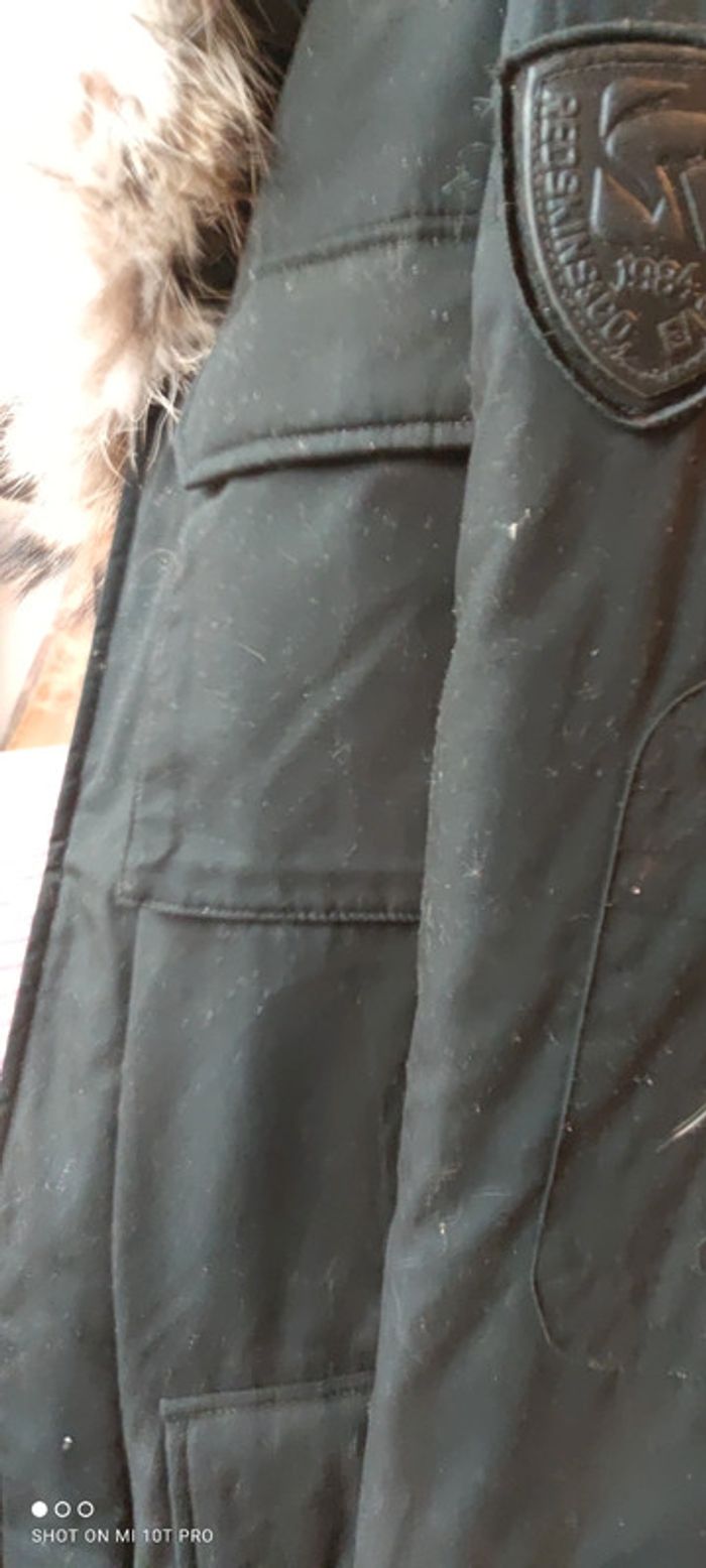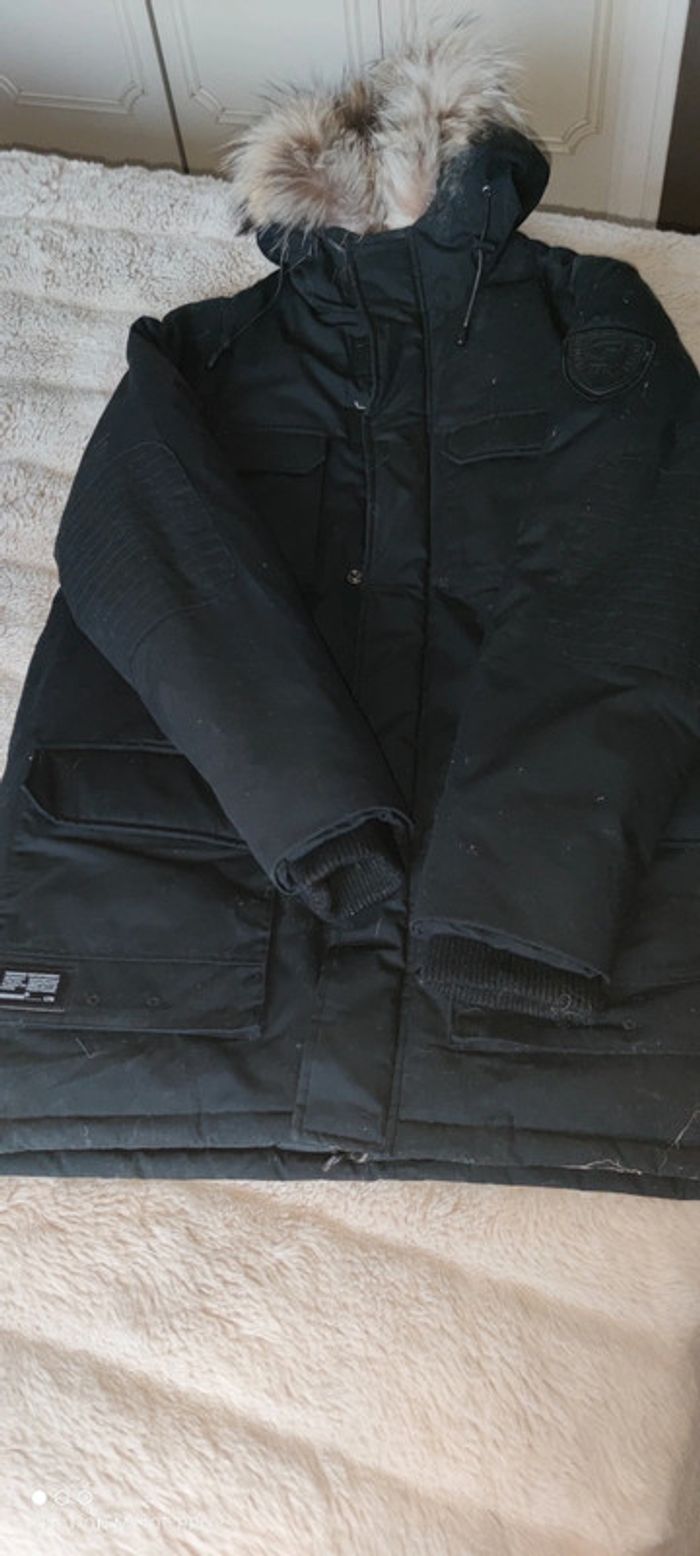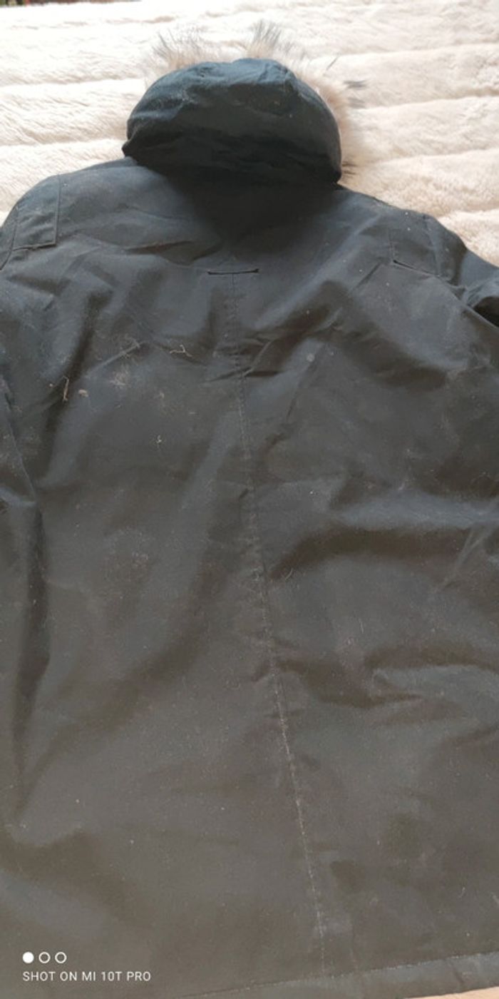 Parka taille L col fourrure fermeture éclair et pression. Quelques petits trop dans le dos au niveau de l'épaule non visibles