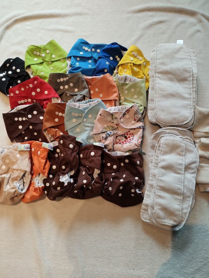 Vends couches lavables d'occasion. Le lot se compose de 13 couches de marque inconnue, de 5 couches B'bies, 19 inserts, 4 voiles polaires. Les couches sont des Te1. Je les avais achetées d'occasion (elles avaient servi pour un enfant ) , de mon côté elles ont aussi servi pour seulement un enfant. Les couches ont été décrassées. Routine de lavage 1er cycle 30° express, rinçage +. 2eme cycle 40° coton, rinçage +. Lessive Ariel poudre. Couches ajustables en taille, conviennent de 3 mois a la propriété (selon le gabarit de l'enfant bien sûr )
