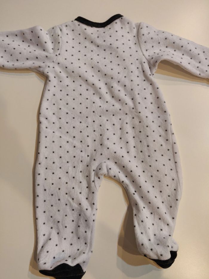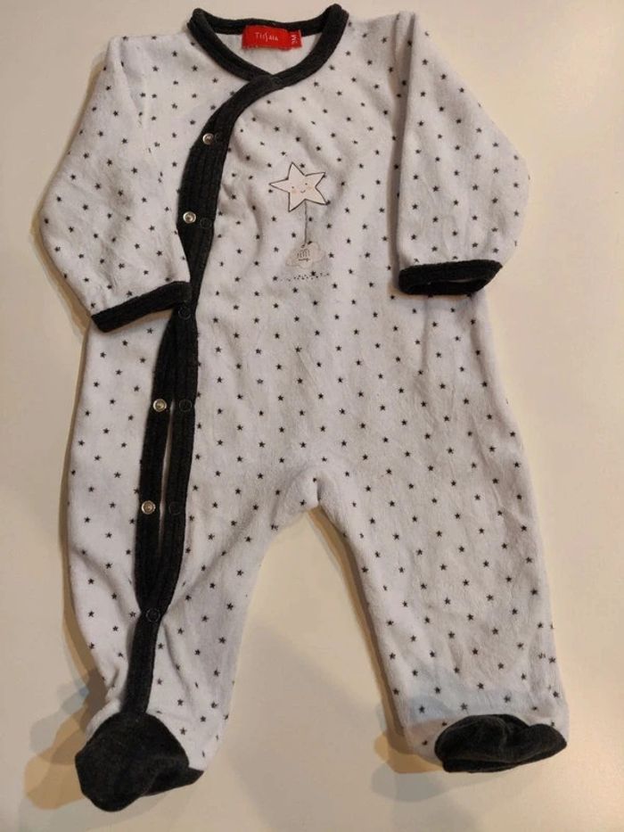 Pyjama blanc avec les bords gris et des petites étoiles grises de partout. Pressions sur le devant Taille 3 mois. Jamais porté juste lavé.