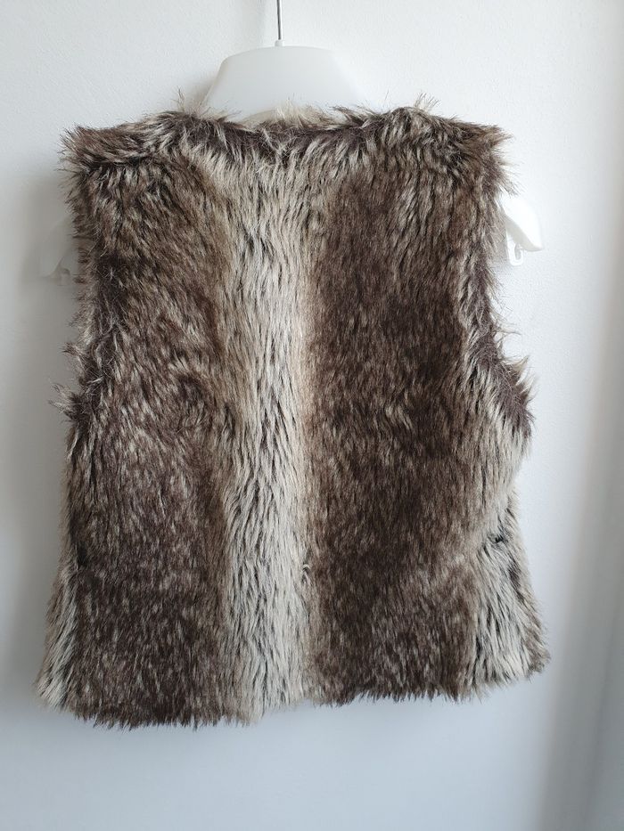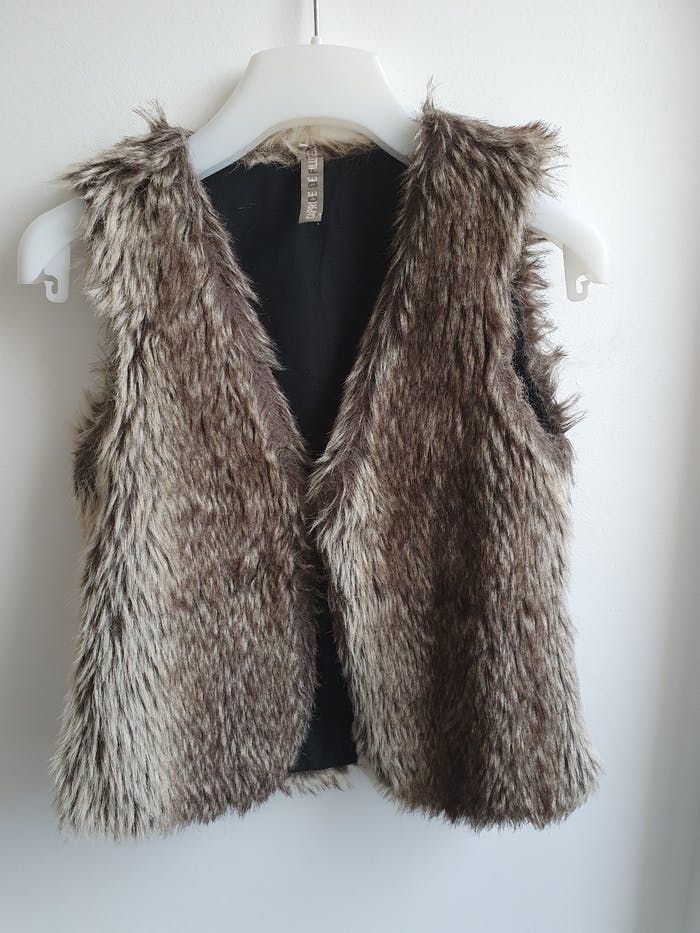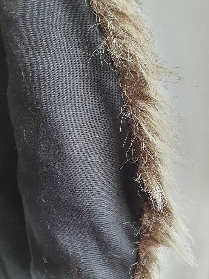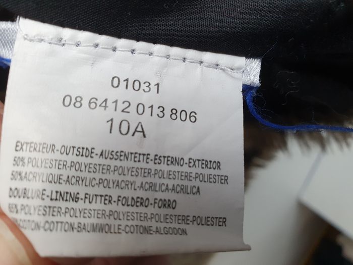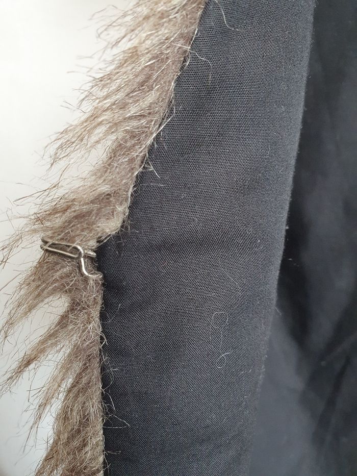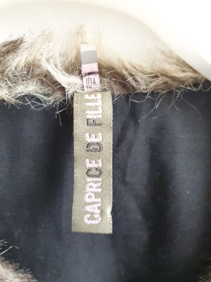 Doudoune doublé type fourrure Fermeture par une agraphe, mais manque une attache Portée ouvert Possibilité de mettre une ceinture (présence de de passage ceinture) Extérieur 50% polyester 50% acrylique Intérieur 65% polyester 35% coton Marque : caprice de fille