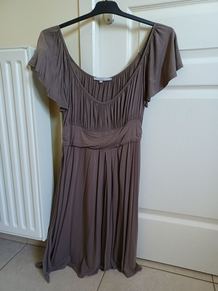 Jolie robe raille empire, resserrée par un bandeau à nouer. Couleur taupe / marron glacé Prix ferme, merci