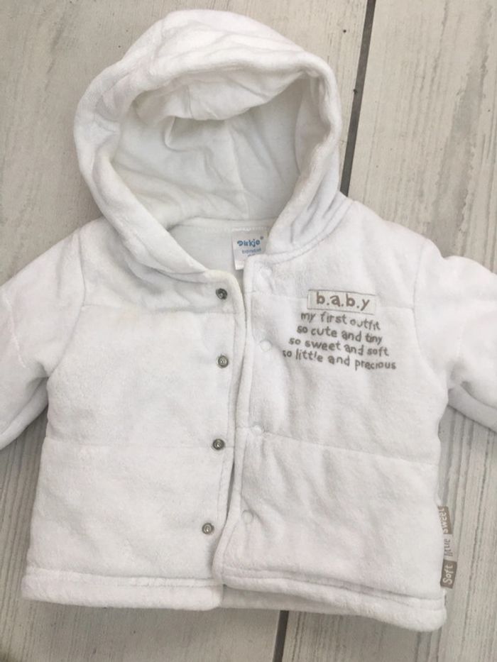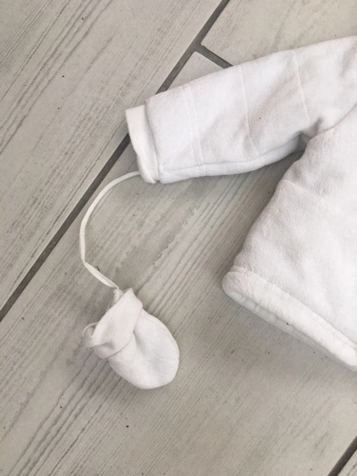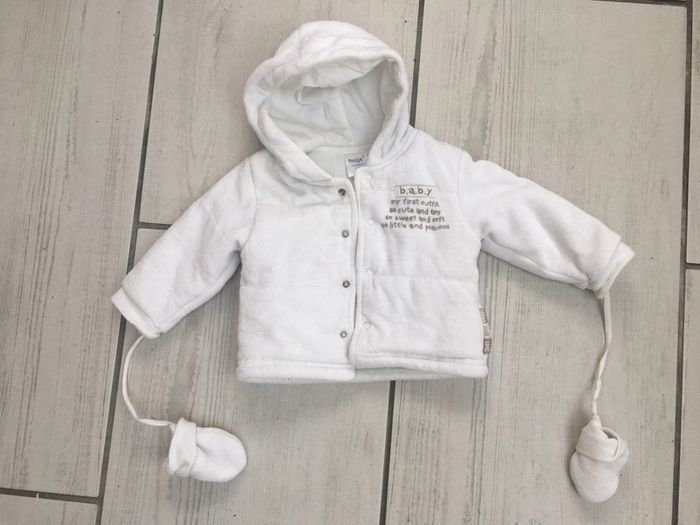Manteau blanc hiver avec gants en très bon état taille 3 mois