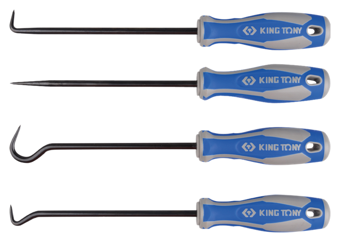 Jeu de 4 grattoirs-crochets de 260 mm Poignée bi-matière PP+TPR Finition chromée polie lame de 150 mm Crochet de différentes formes Jeu comprenant: 43250115Y: Crochet grattoir coudé 43260115Y: Crochet grattoir avec embout en crochet 43270115Y: Crochet grattoir avec embout en L à 90° 43290115Y: Crochet grattoir avec embout en poinçon Marque KING TONY NEUF