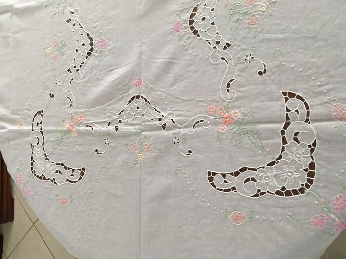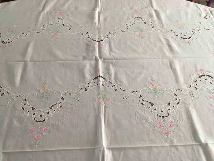 Magnifique ensemble nappe et 12 serviettes en lin très fin Broderie d'une très grande finesse, motif fleurs. Contour feston. Neuve jamais utilisée. Déballée pour la photo. Dim : nappe 260 cm x 170 cm Dim : serviette 40 x 40 cm
