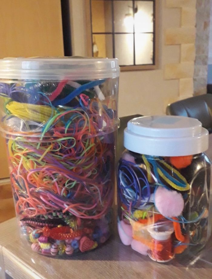 Lot de 2 boîtes de scoubidou Il contient : - des scoubidous - des porte-clés - une chenille - des pompons -des perles en bois -fil métallique - une notice
