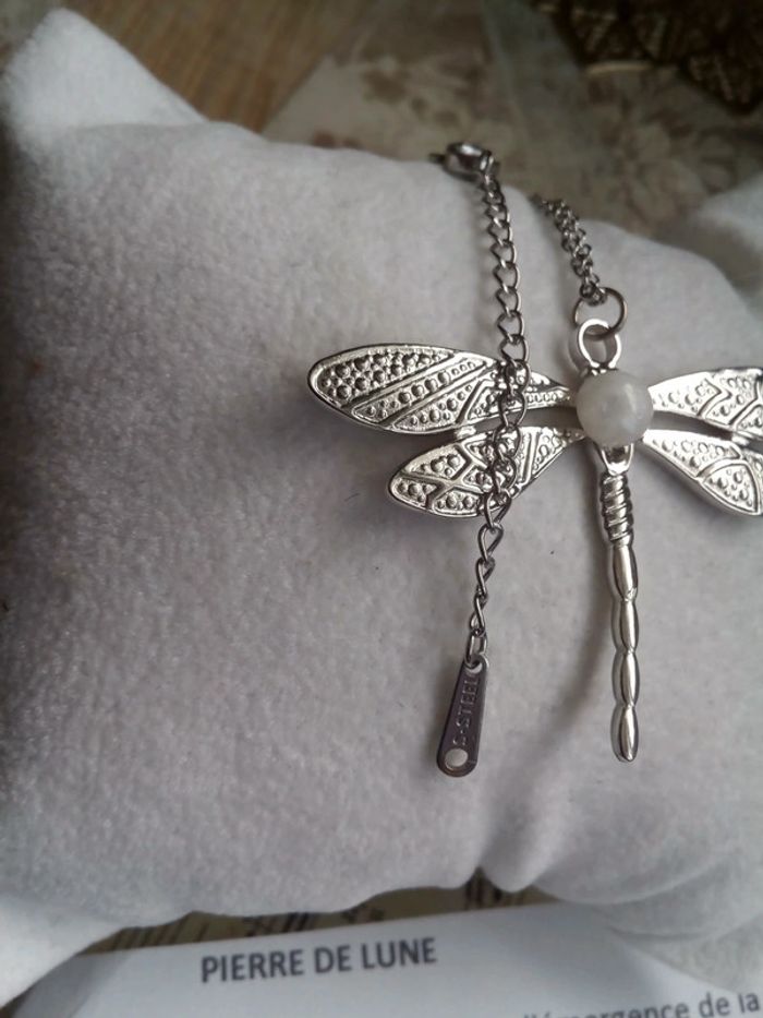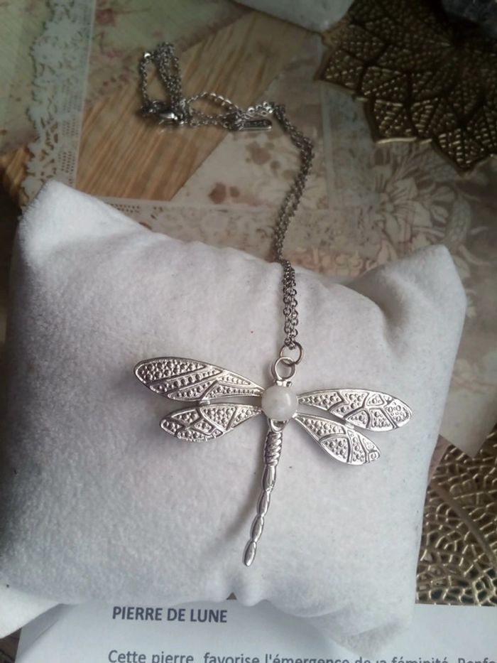 collier libellule argenté et sa pierre de lune naturelle - photo numéro 3