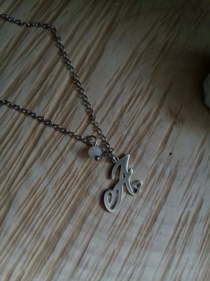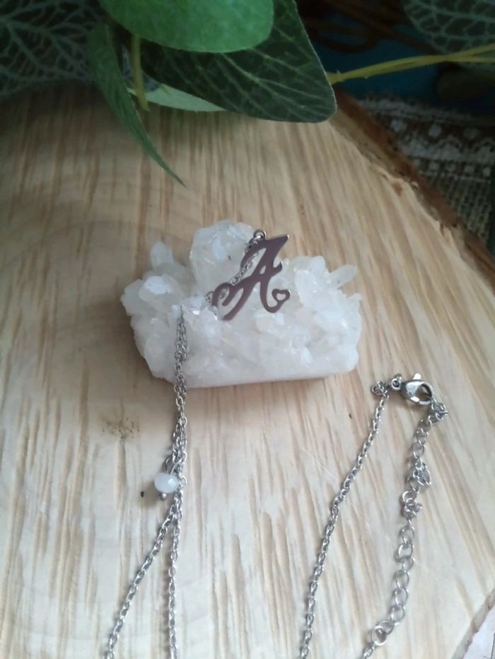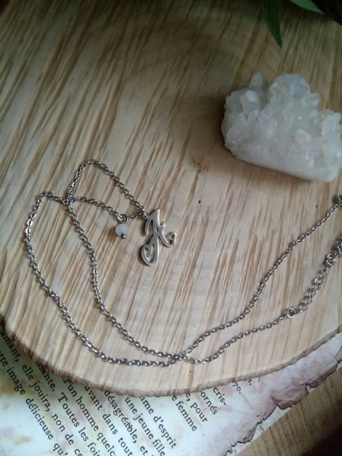 Collier en acier inoxydable plaqué argenté Lettre A et pierre de lune Réglable par chaînette d'extension Lithothérapie Voir aussi TomTom chi litothérapie bola pierre bohème cadeau prénom