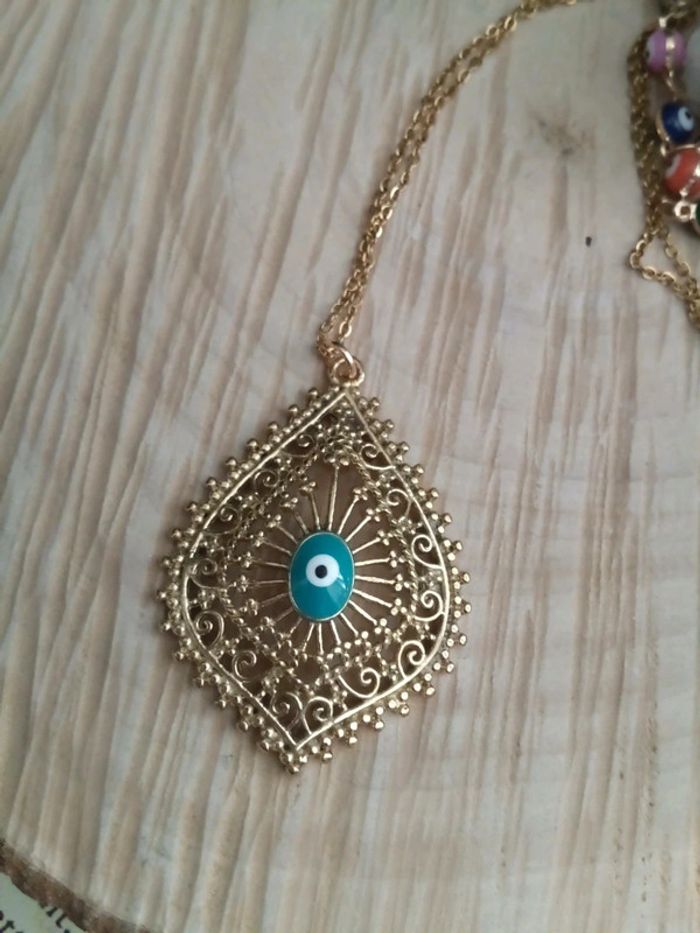 Collier 25 e+ bracelet 15 e (n.e.u.fs) Contre le mauvais oeil Acier inoxydable plaqué doré 44 cm Voir aussi mortelle Adèle oracle lithothérapie bola turban magie wicca bohème cadeau pierre naturelle d'obsidienne jade labradorite charoïte larimar pendule chi dogna ethnique chic indien oeil turc