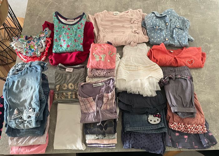 Lot fille 24 mois 4 jeans 1 legging 1 pull fin 9 teeshirt manches longues 4 jupes 3 shorts 2 robes 1 pyjamas fin 1 chemise manches longues 2 bas de maillot 1 boléro