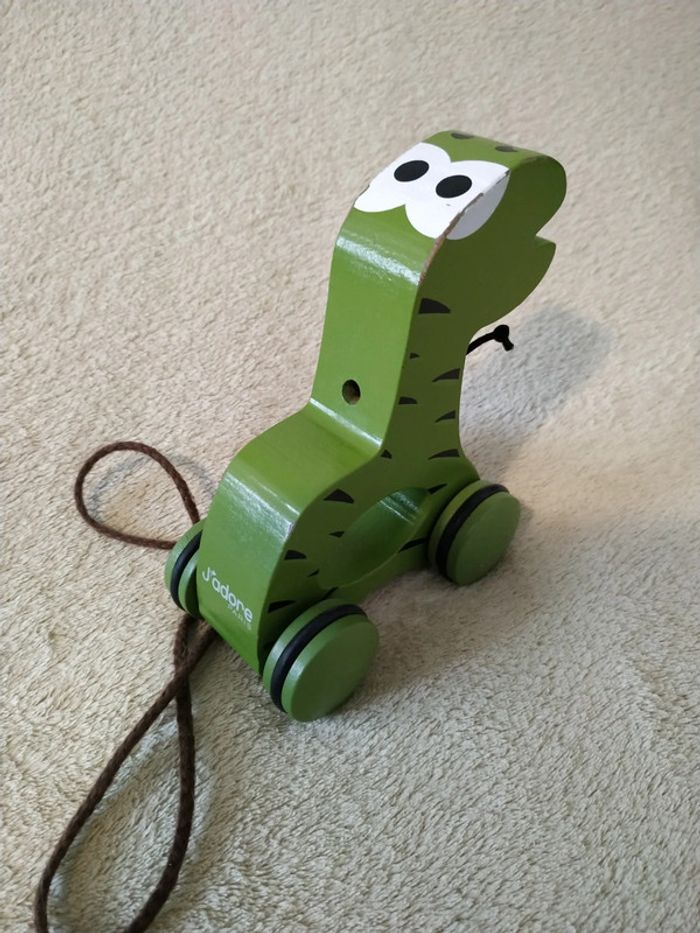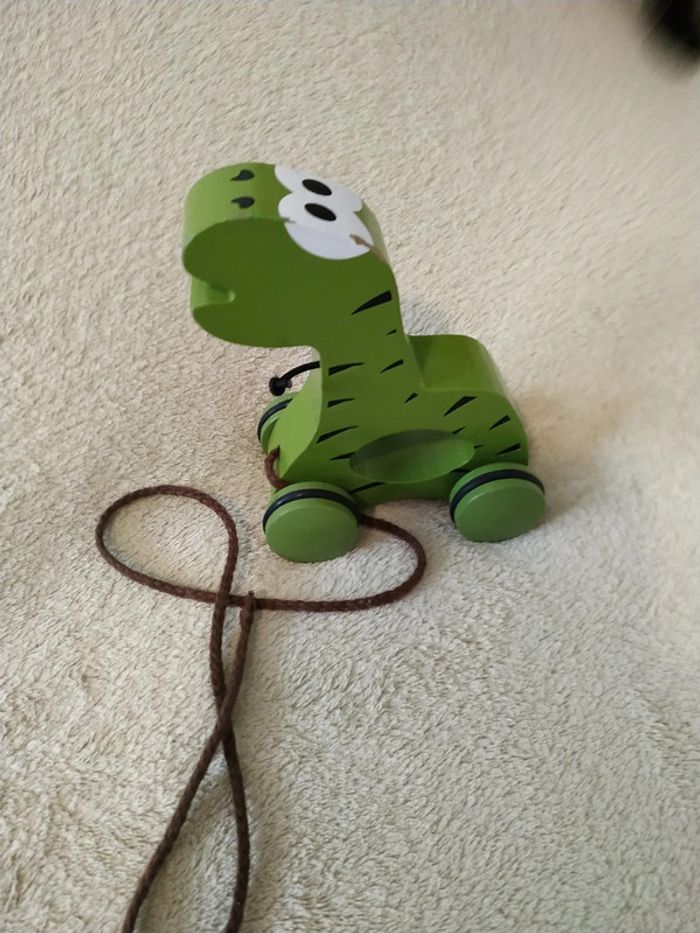 Dinosaure en bois avec roulettes et ficelle à tirer. Très bon état général juste quelques endroits où la peinture est partie à force de frottement. Maison non fumeur. D'autres vêtements et jouets disponibles, n'hésitez pas à jeter un œil dans mon dressing (réduction si commande de plusieurs articles). #marion_pel_jouets