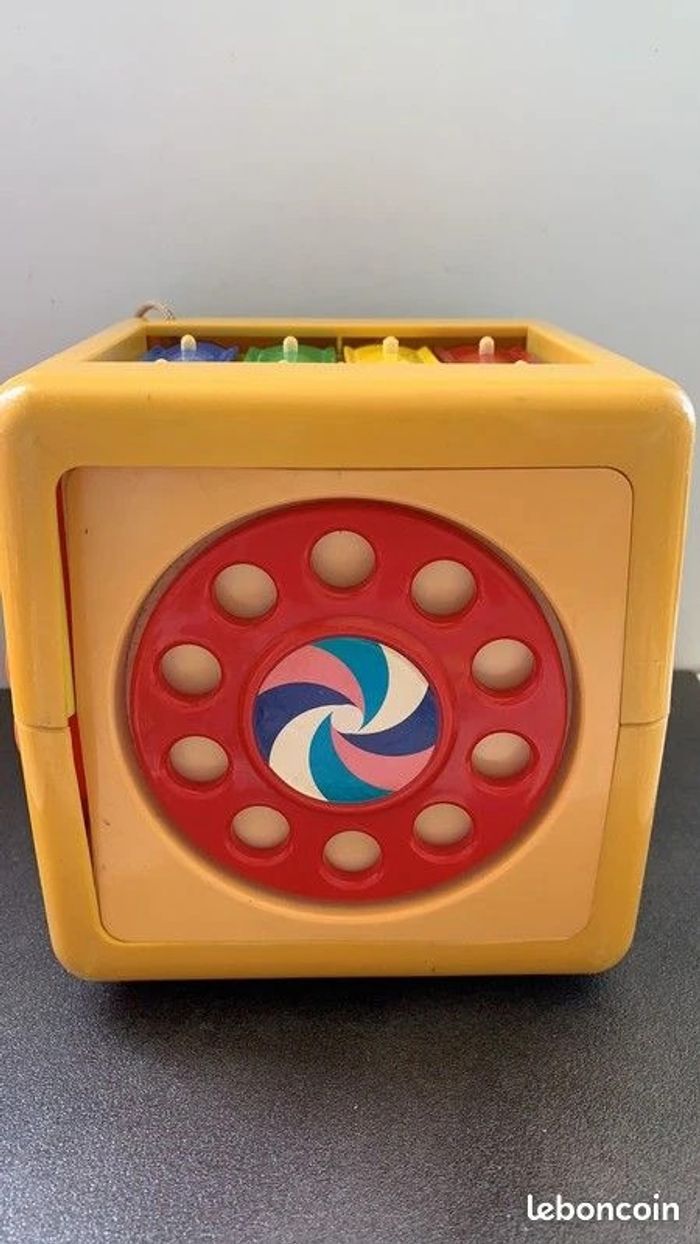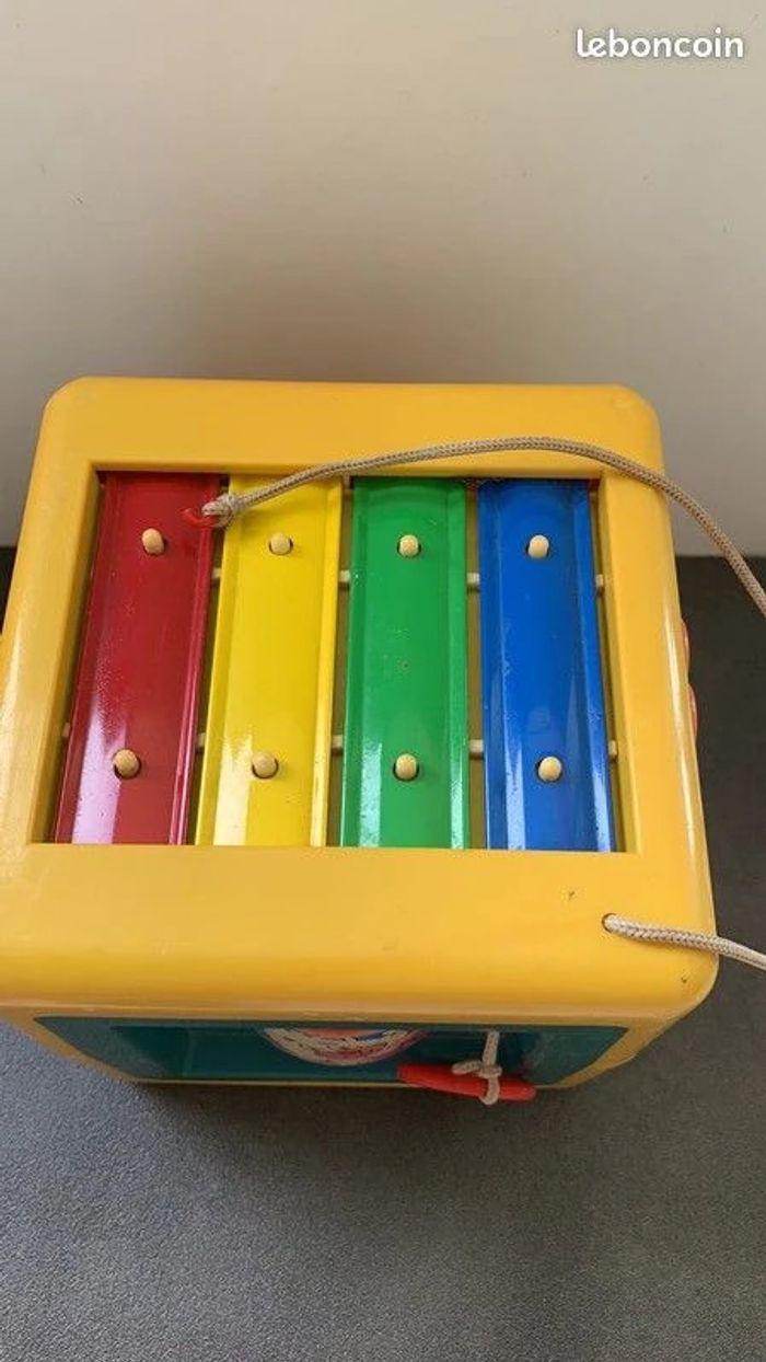 Jouet d'éveil Cube multijeux Vintage Diamètre 14 cm Une face Chat (on appuie sur le nez et ça fait un "pouet pouet") Une face trompe l'oeil (ca tourne avec le doigt) Une face animaux Une face billes dans boîte Une face chat qui bouge quand on tire la languette Une face musique Xylophone mais manque le bout dur (à remplacer) pour taper