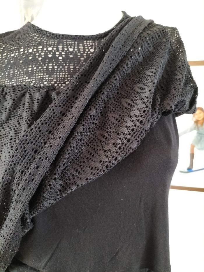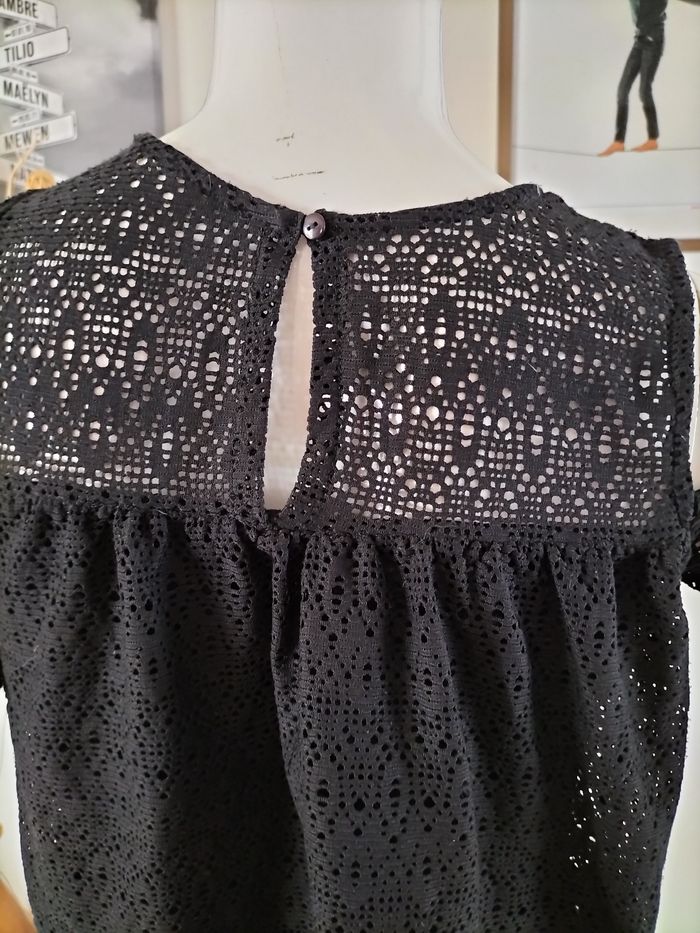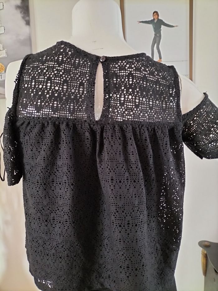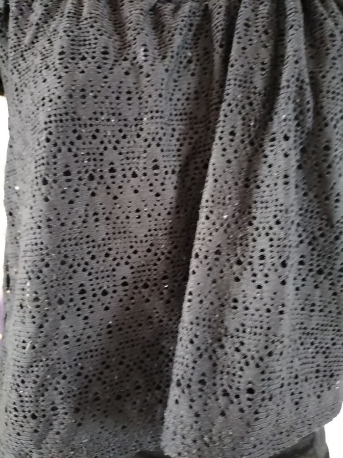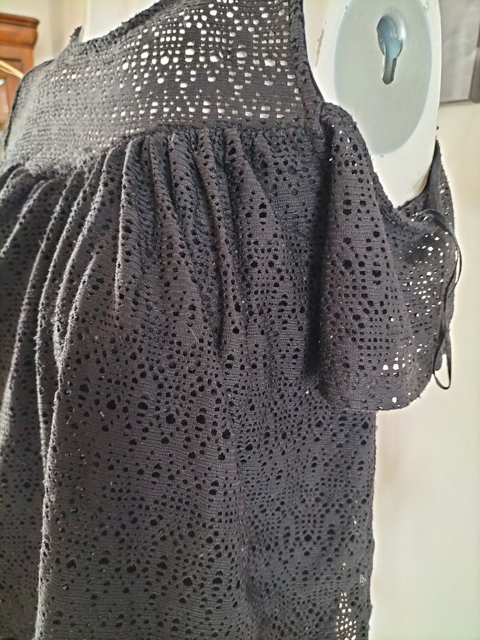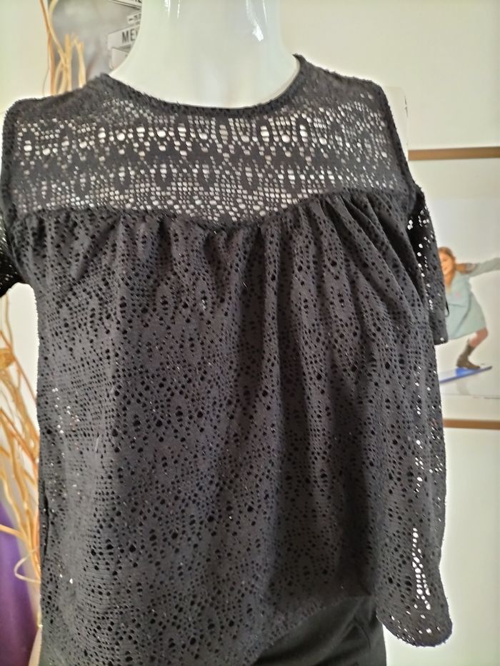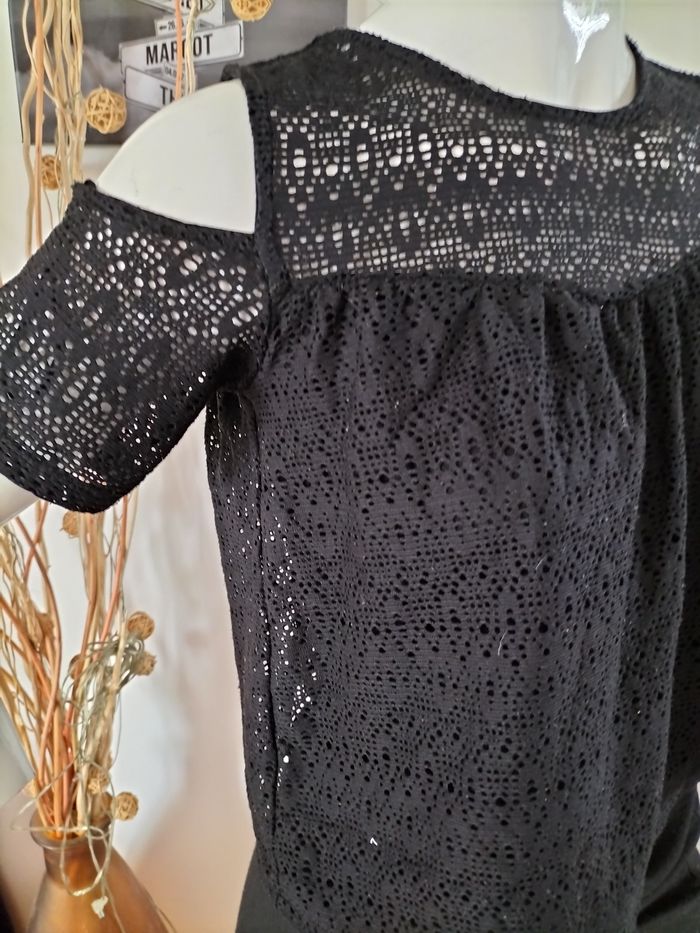 Haut noir court doublé avec manches courtes épaules dénudées . Acrylique viscose et élasthane Taille petit