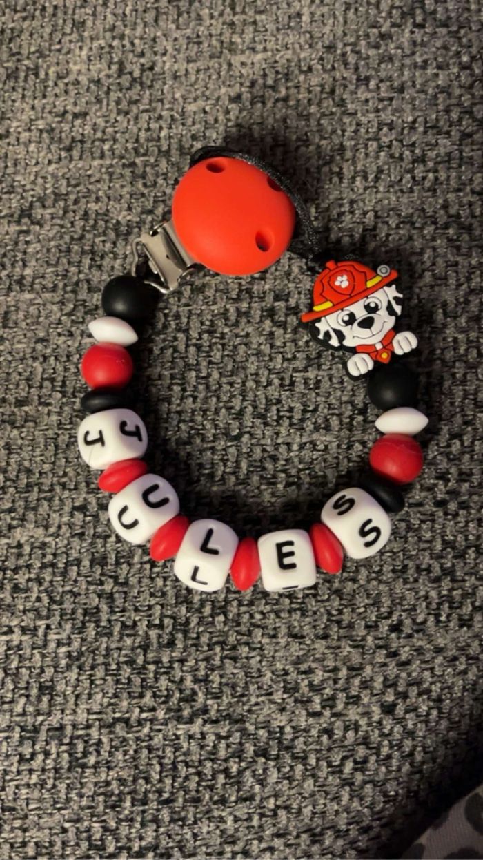 Attache tétine personnalisé en silicone ou en bois au souhait de l’acheteur . Personnalisable au choix de l’acheteur que ce soit la couleur comme le prénom ou le thème . Le fil est doublé pour plus de sécurité tout le long de l’attache tétine. N’hésitez pas à me demander et regarder mon dressing. Une photo vous sera envoyée avant l’expédition pour vous ayez un aperçu du rendu. Tous les produits sont réalisés avec du materiel spécial conçu aux bébés , enfants.