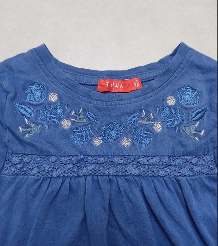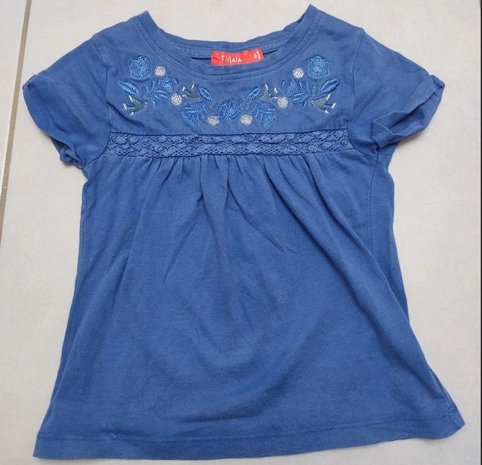 Tee-shirt Manches courtes Tissaia taille 3ans. Coloris bleu. Broderie floral et oiseaux sur l'avant. Dentelle bleu cousu sous la broderie. 100% coton #3ansfillevivi35470