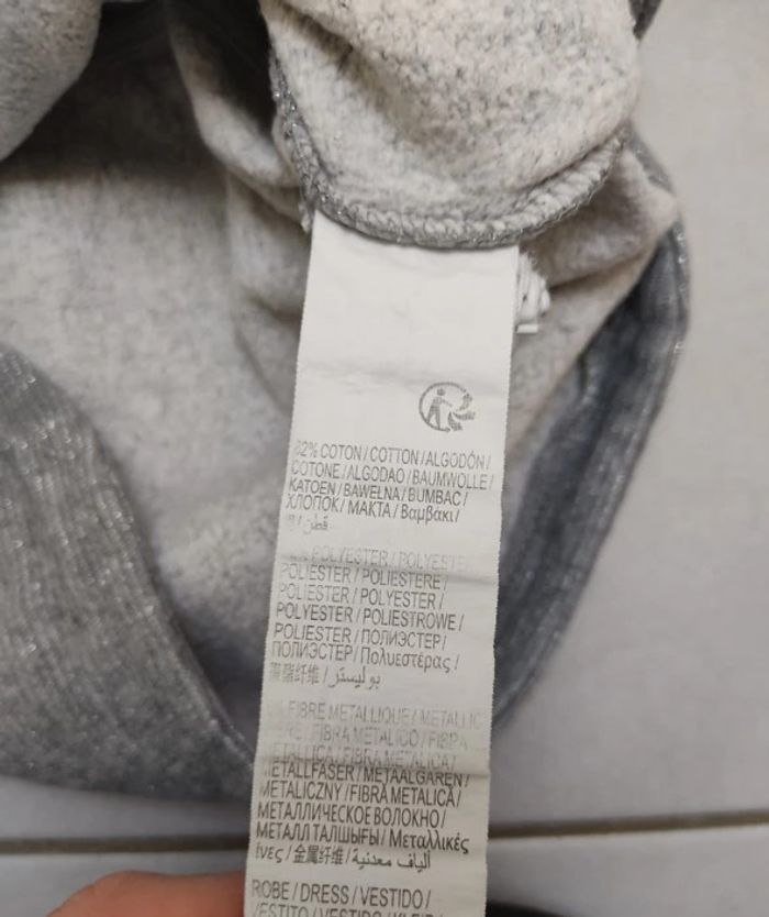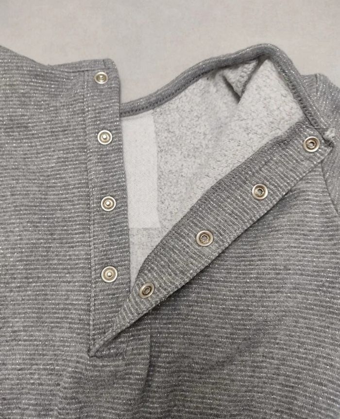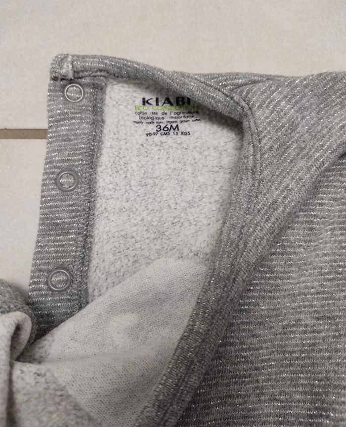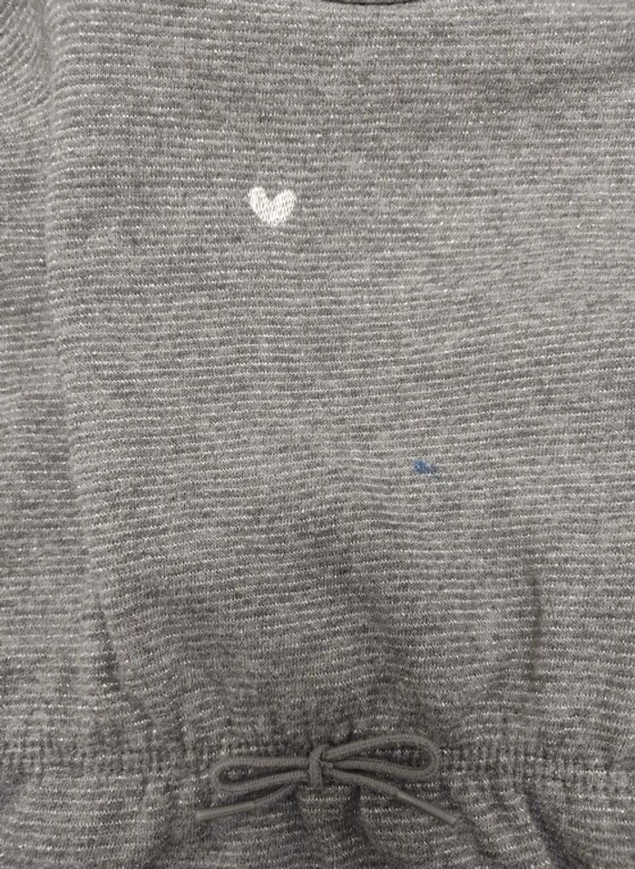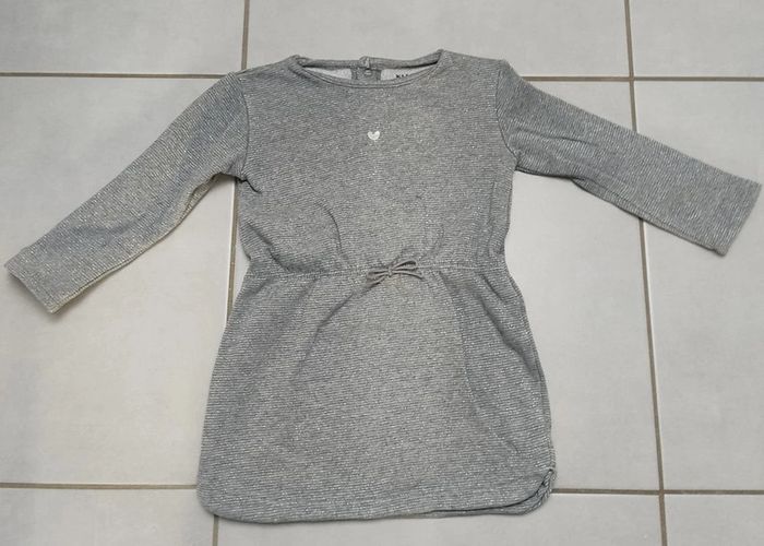 Robe Kiabi taille 3 ans. Coloris gris avec fibre métallique argenté. Resserrée à la taille. Pressions au dos pour faciliter son enfilage. Broderie "coeur"sur l'avant. La robe est en parfait état hormis un petit coup de crayon velleda bleu sur l'avant (voir photo) #3ansfillevivi35470