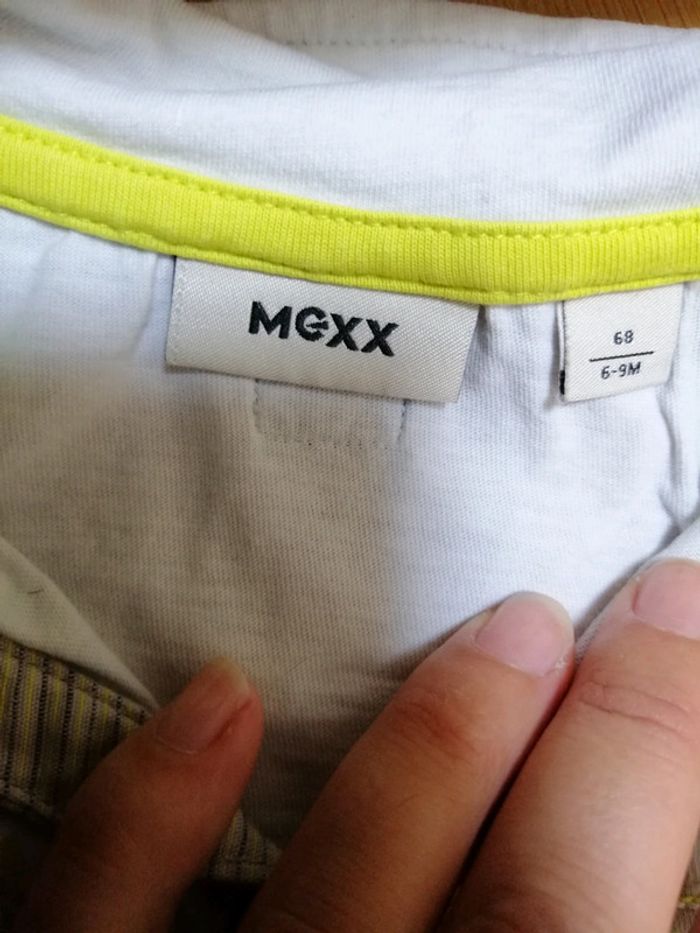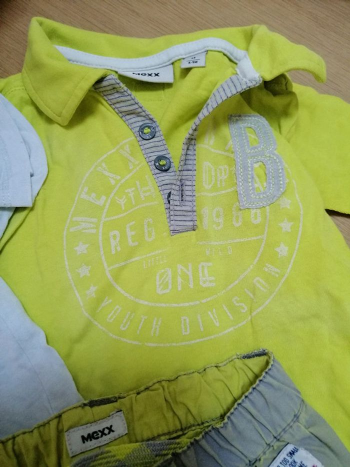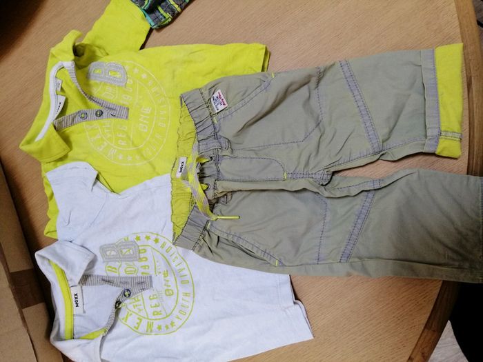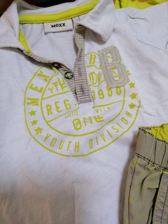 Ensemble garçon. Mexx. Le pantalon change de couleur au fur et mesure des lavage c est normal 😉 un t-shirt vert flashy et un gris beige. En très bon état. 6_9mois