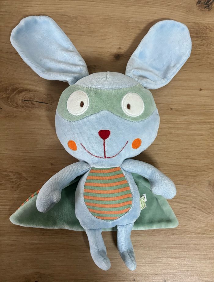 Doudou peluche lapin masque cape bleu vert dpam - photo numéro 1