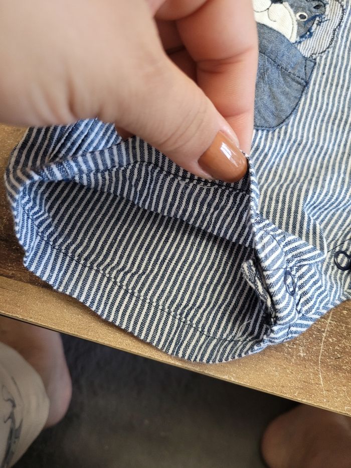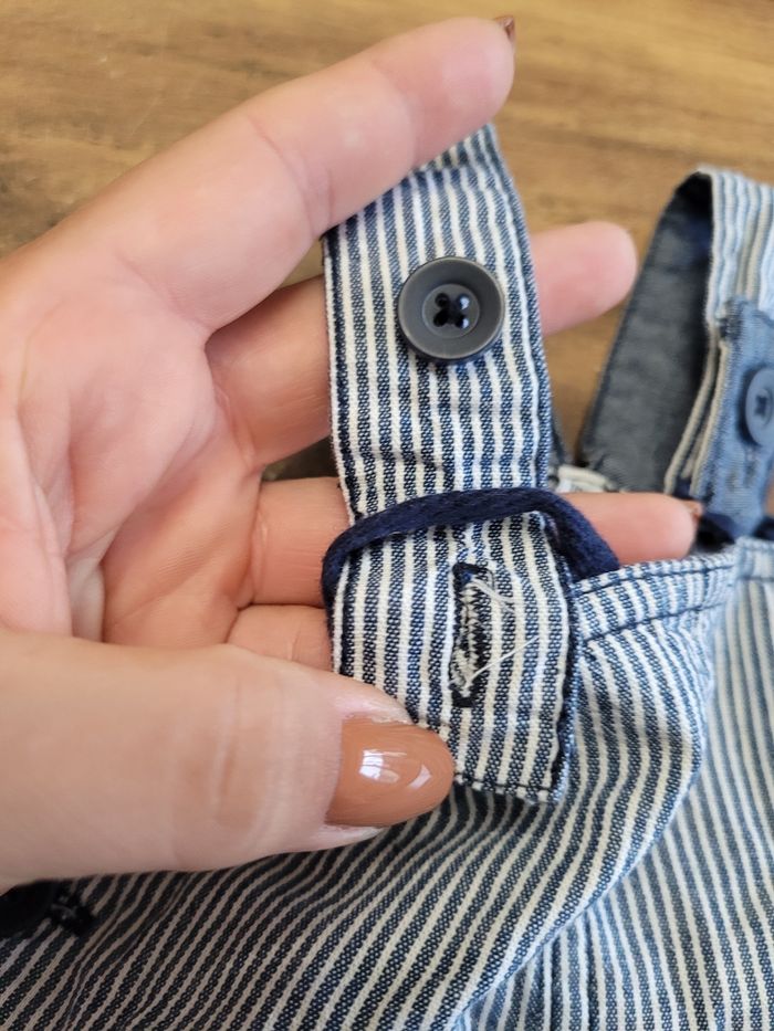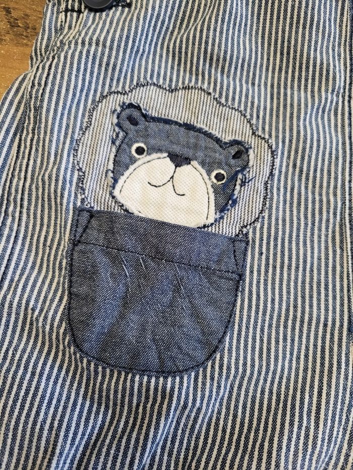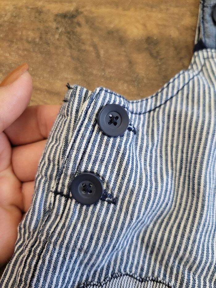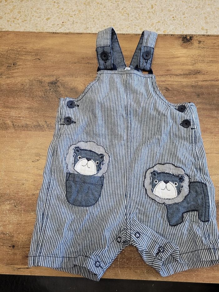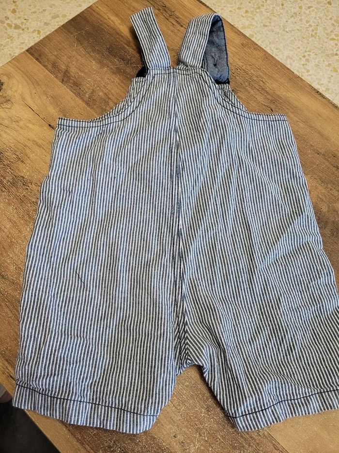 Petit salopette short Couleur bleu et blanc Attaché en haut Attaché aussi en bas par les jambes Mi saison Taille 18 mois