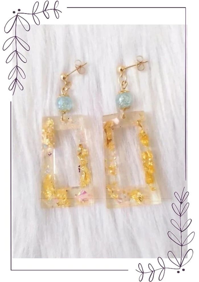 Boucles d'oreilles créoles rectangulaires en résine avec feuille d'or. - photo numéro 1