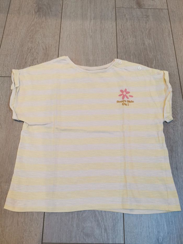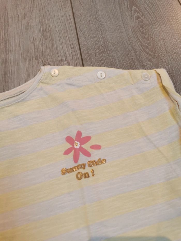 Tee shirt manches courtes Kiabi A rayures beige et jaune pâle Joli motif rose et doré Très bon état #myriampage_fille10ans