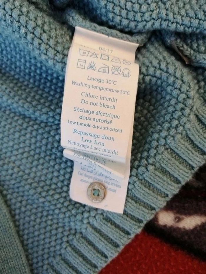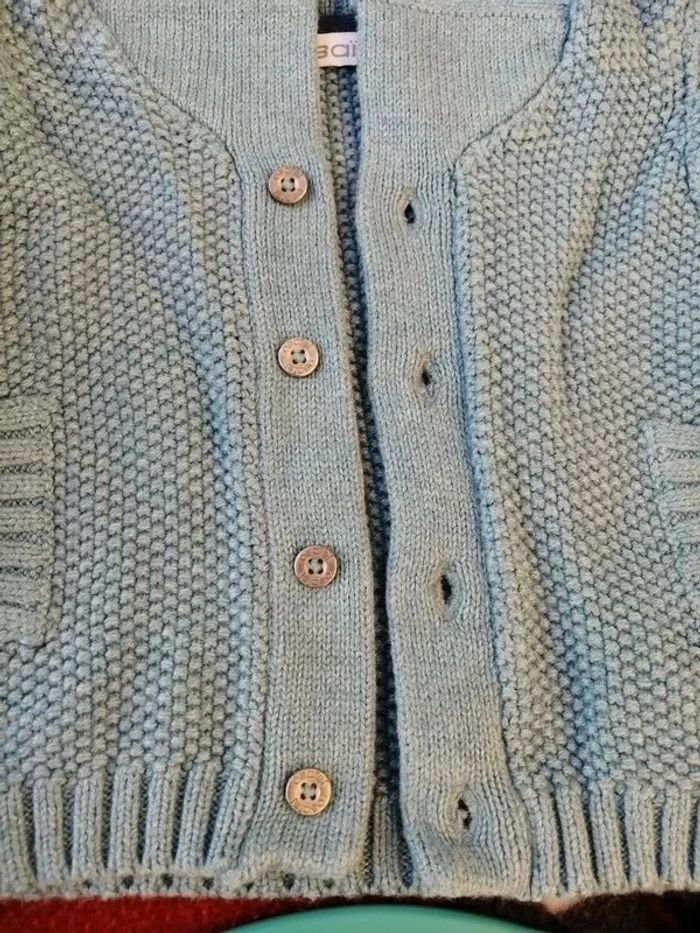 Pour accéder aux vêtements taille 3 mois appuyez ici---> #kat59147bébé3mois Beau gilet coulejr bleu tirant turquoise, bouton de rechange présent. Peu porté #hiverbebe #hiver #garcon3mois #obaibi