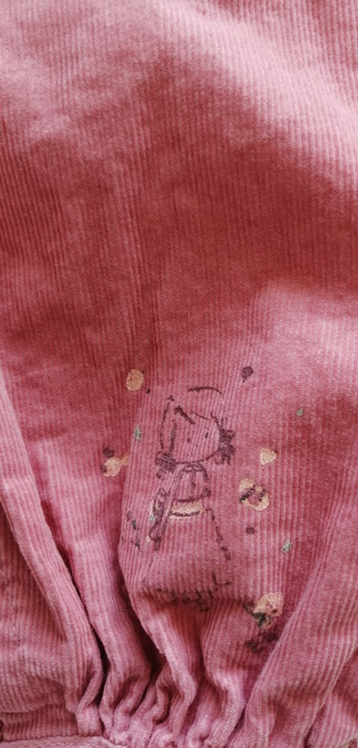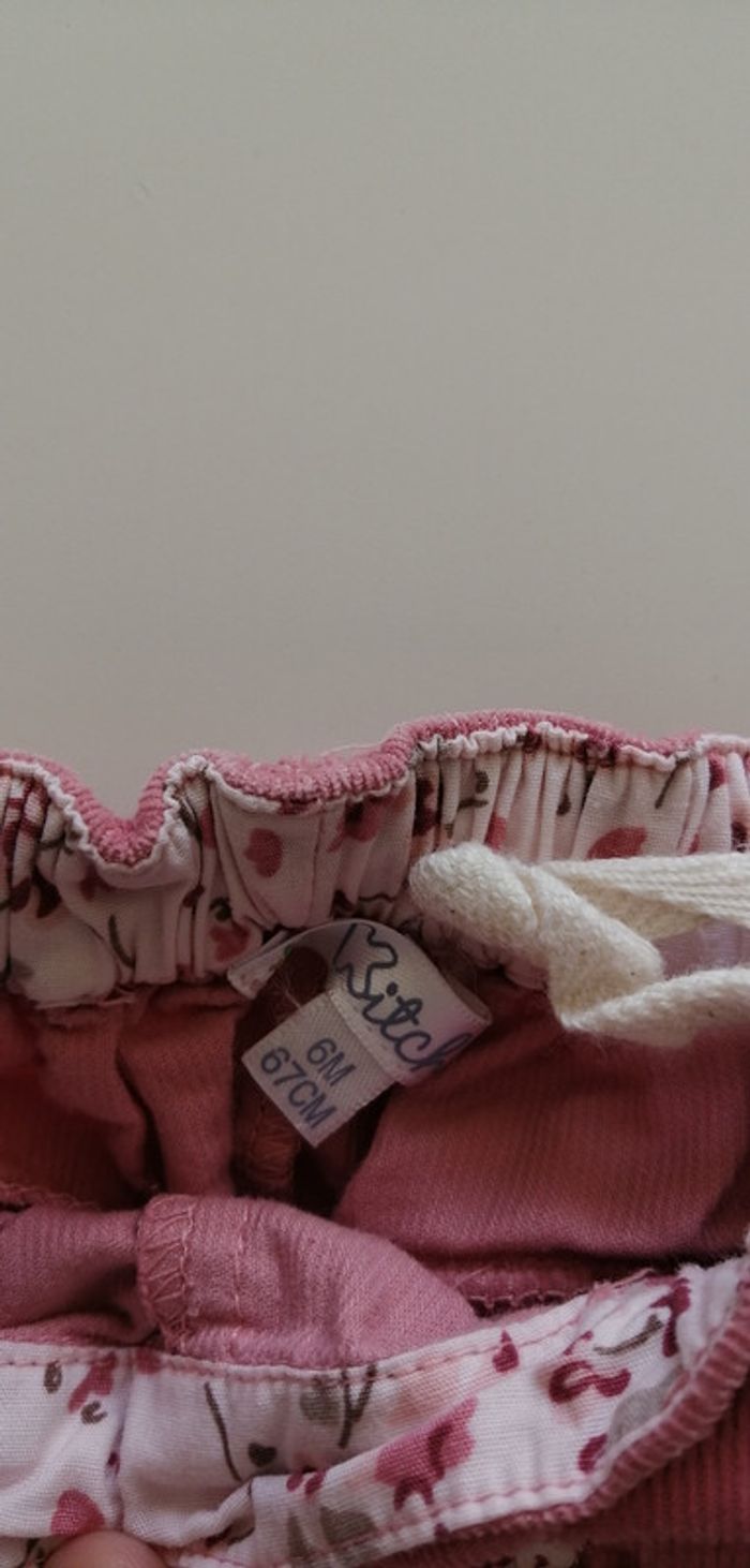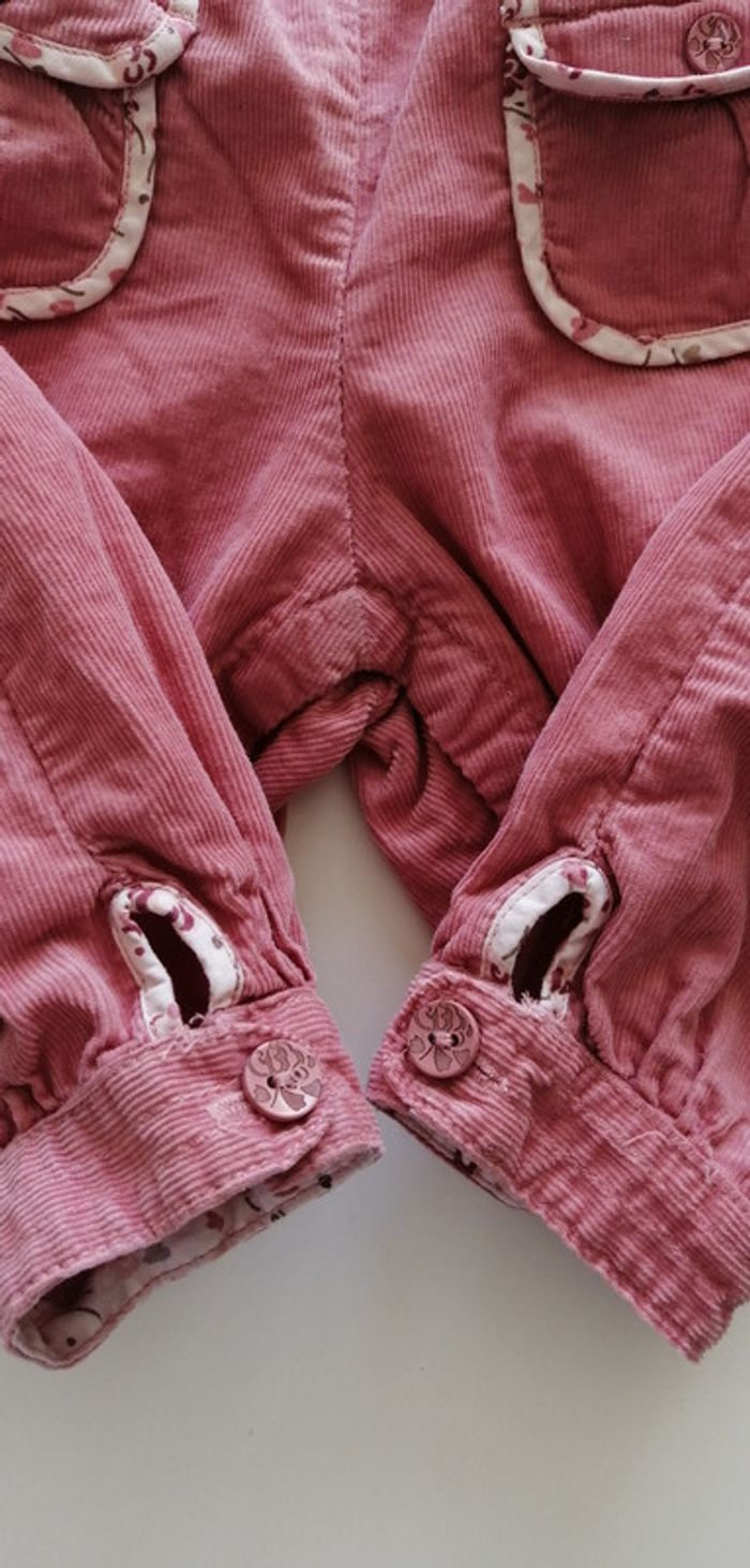 Pour accéder aux vêtements taille 6 mois appuyez sur-->#kat59147fille6mois Petit pantalon type velours côtelé couleur rose limite vieux rose. 2 poches avant et 2 arrière, resserage auxchevilles par boutons. Déco petite fille se craque légèrement