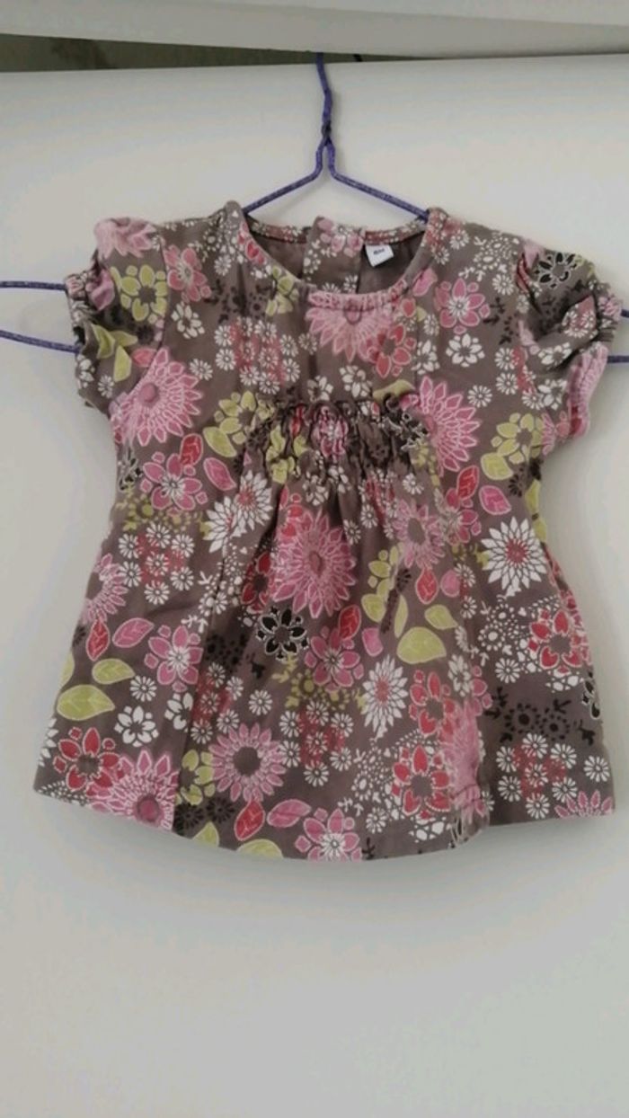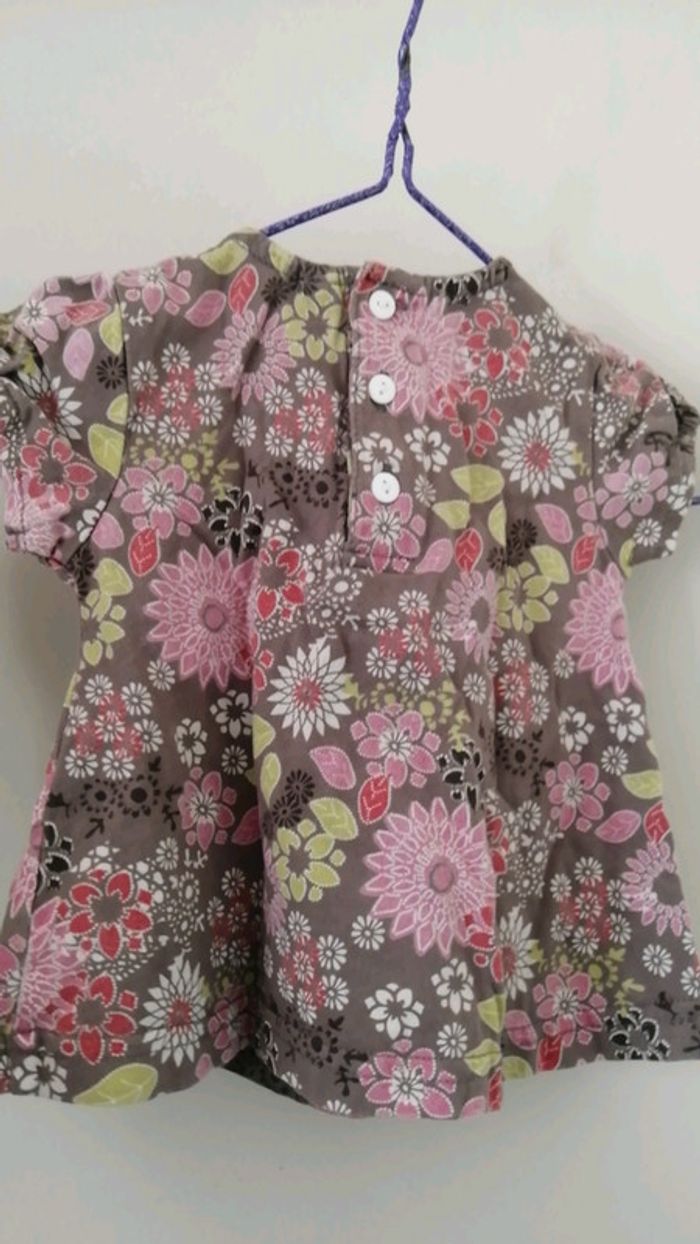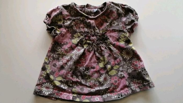 Pour accéder aux vêtements taille 6 mois appuyez sur-->#kat59147fille6mois joli t shirt lavé mais non porté acec froncage sur le devant couleur entre le marron et le kaki motif floral. Fermeture au dos par boutons #été
