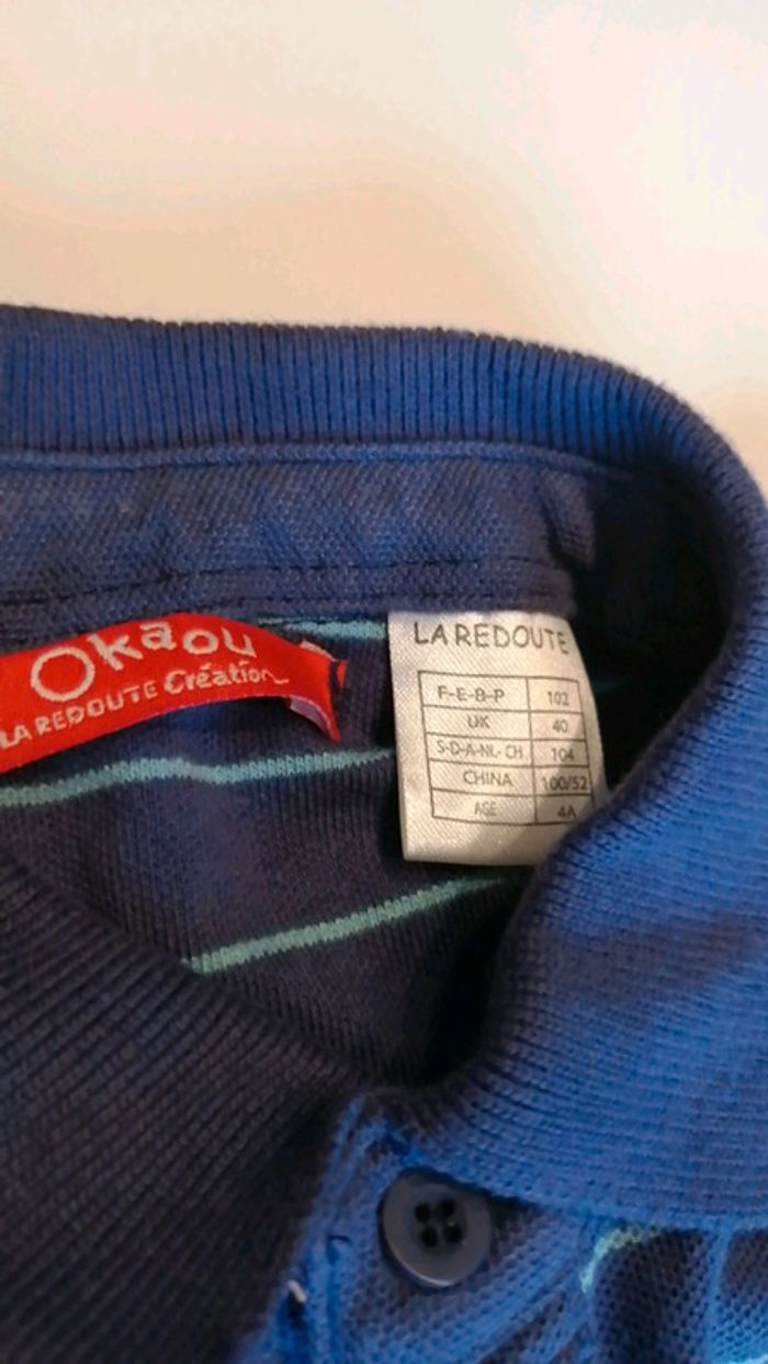 #kat59147garçon4ans Polo rayé bleu de la marque la redoute, fermeture col par boutons, petite poche et flocage en bas. Très peu porté