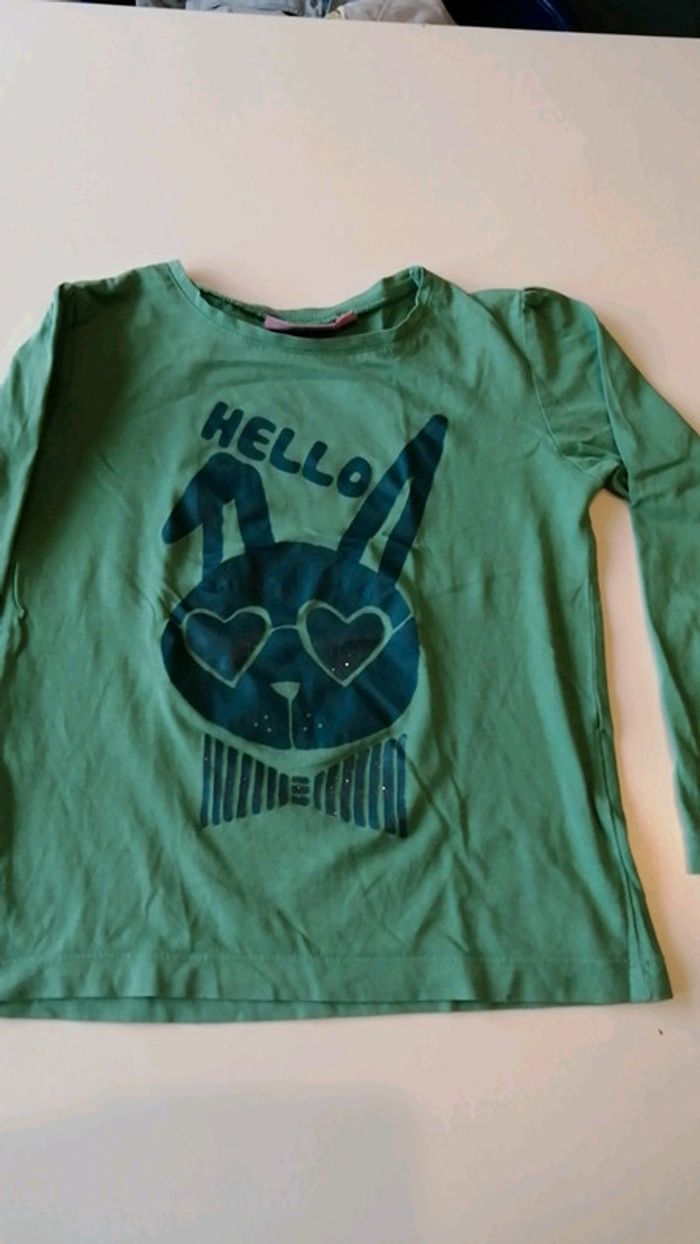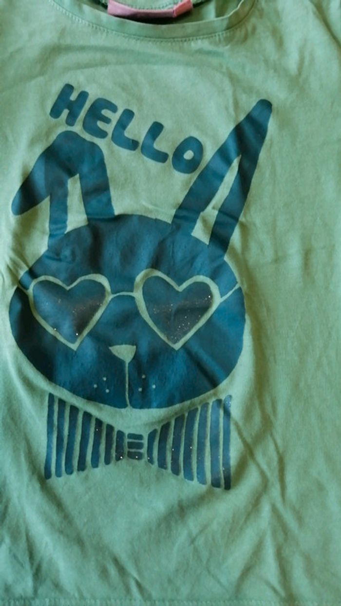 Pour accéder aux vêtements taille 6 ans appuyezsur-->#kat59147fille6ans Propose t shirt ml vert dessin lapin vert foncé. Un point de couture visible a l endroit de l étiquette sur le côté.