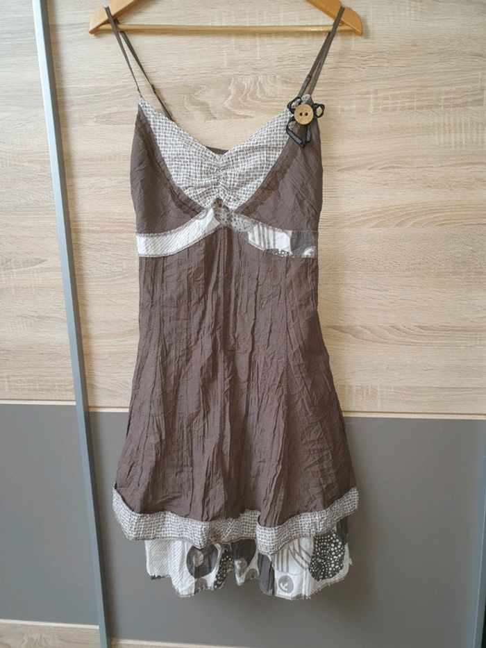 Petite robe style frou frou, taille unique. Élastiqué derrière la poitrine. Bien porté mais reste en bon état. Il faudra juste prévoir de recoudre une bretelle voir photo 4. Envoi en mondial relay uniquement.