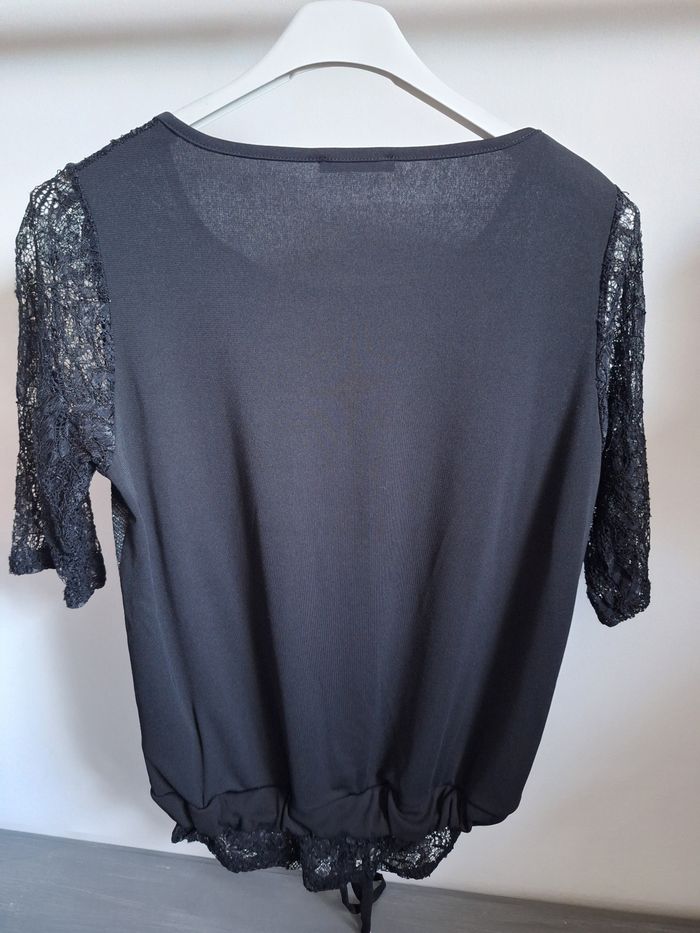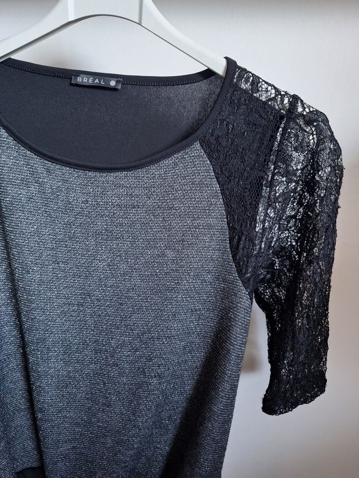 FEMME 36 / S N°1581 maillot gris / noir Pailette , dos Voile noir Manche broderie noir / bas Cordon au bas 65 % polyester 35% coton Taille 36 / s Breal 8,50€ #kelly_femmeT36