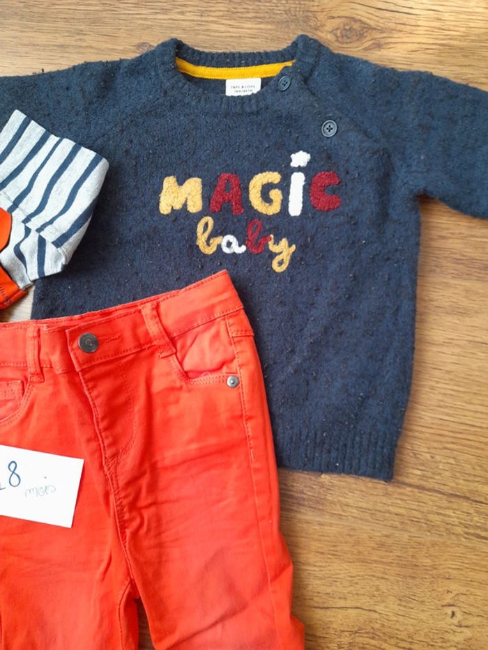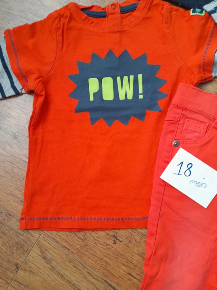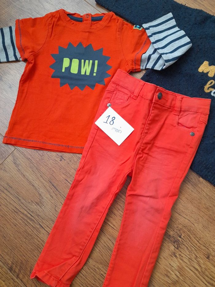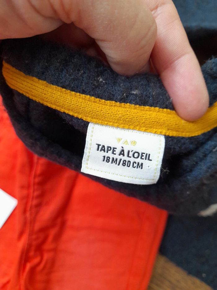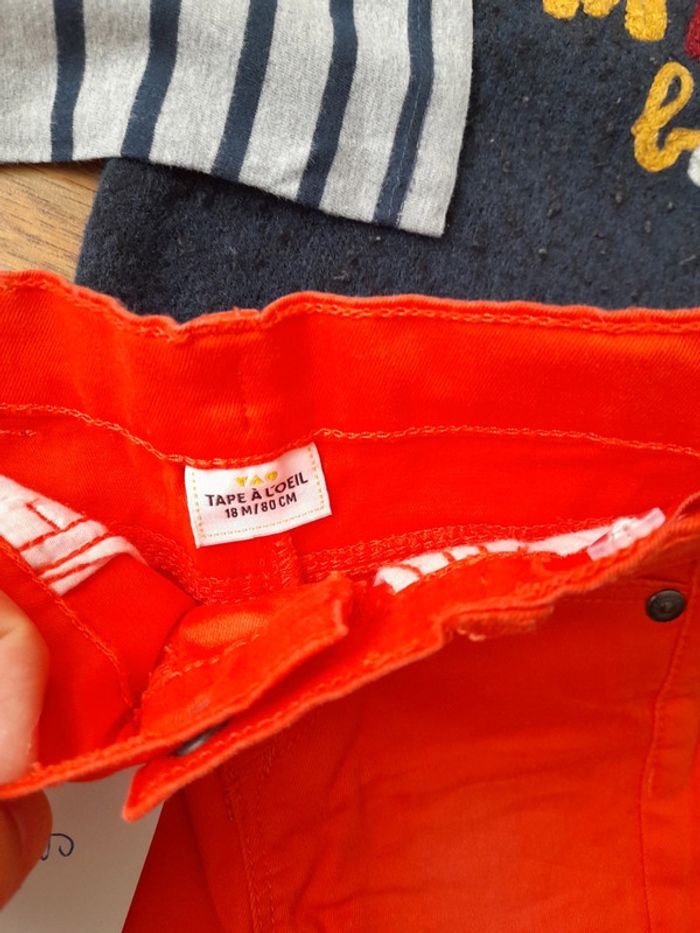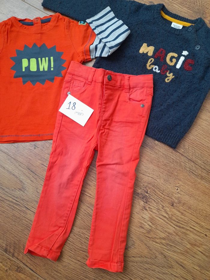 Pantalon rouge porté une fois état impeccable et pull tape à l'œil bon état. Un Tee shirt manches longues Neuf orchestra Réduction intéressante en lot #18moisbabyestlé