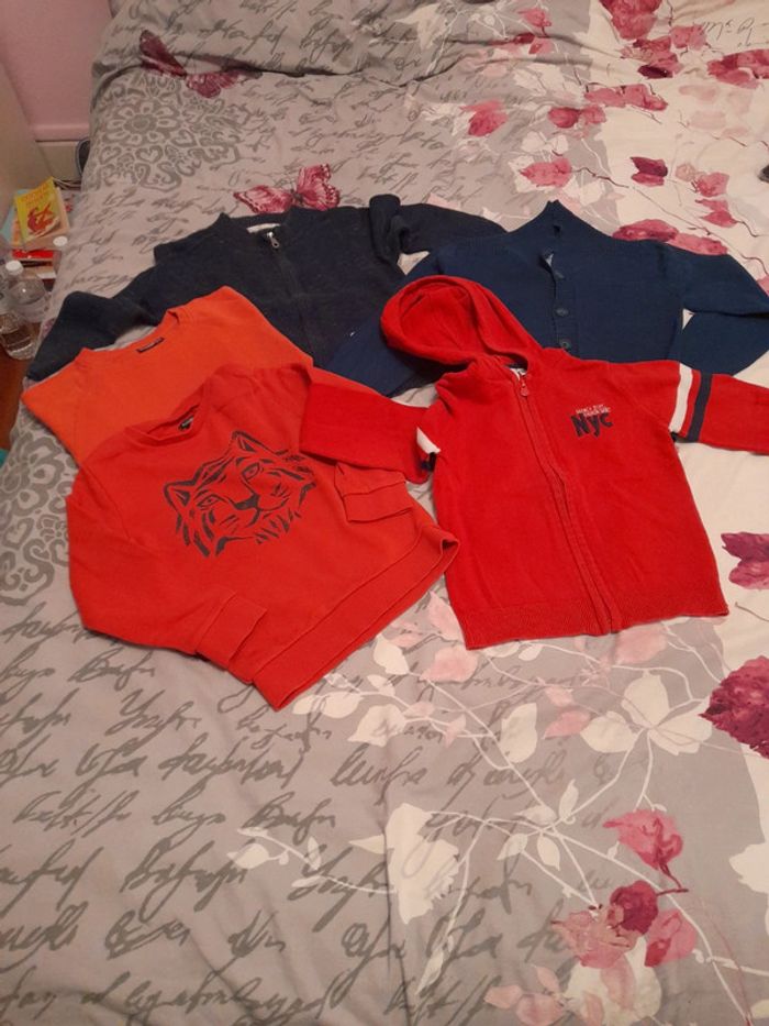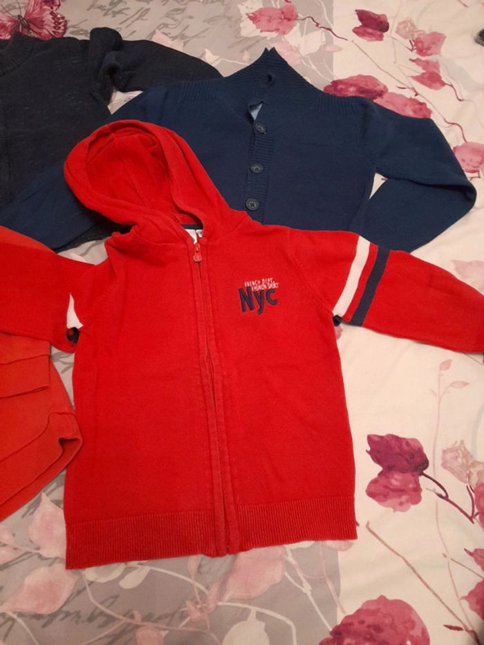 3 gilets 2 pulls Différentes marques grain de blé, littérature sioux orchestra, influx et kiabi Très peu portés Minuscule accro pull rouge #4ansbabyestlé