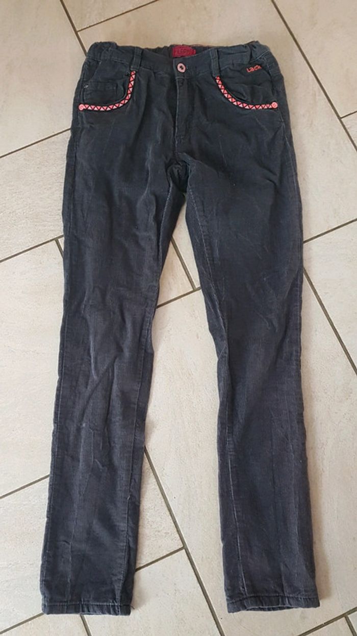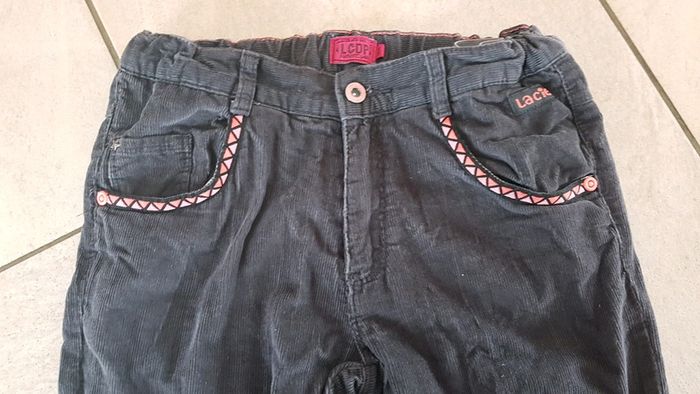 Pantalon en velours gris avec déco rose, taille ajustable avec élastique, taille 12 ans, de la marque La Compagnie Des Petits, en très bon état car porté une fois.