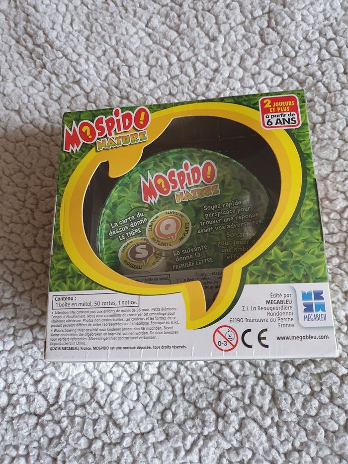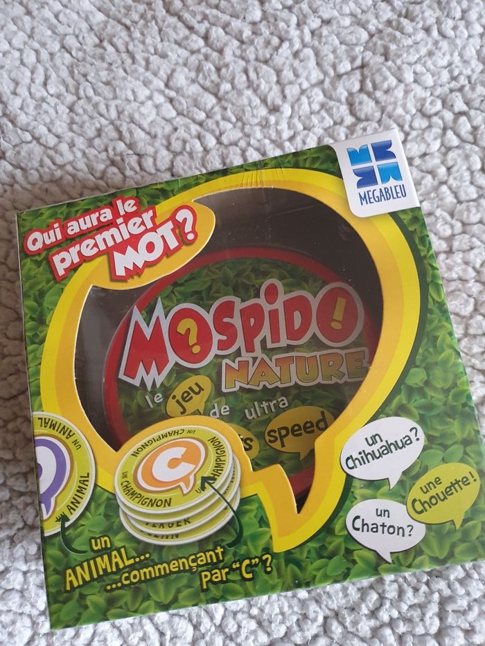 Jeu mospido nature où il faut trouver rapidement un mot sur un thème donné avec la lettre de début du mot. 50 cartes, 2 joueurs et plus dès 6 ans. Neuf sous blister .