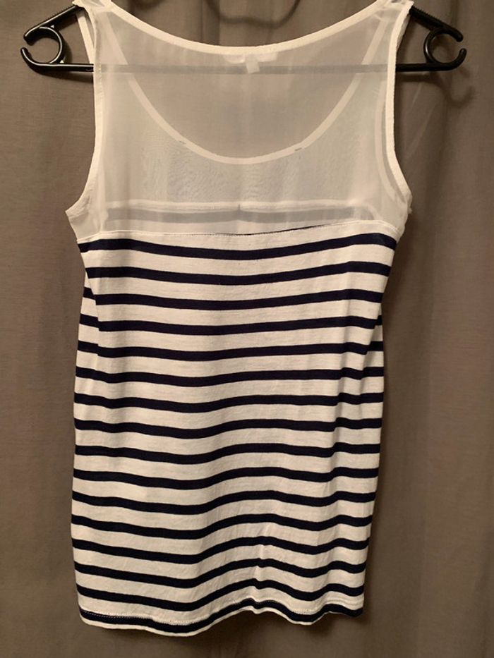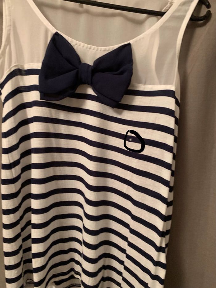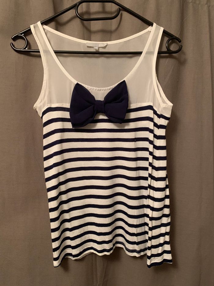 débardeur etam taille xs rayé blanc et bleu avec noeud sur le devant un petit point est à prévoir mais sur la rayure bleu donc non visible