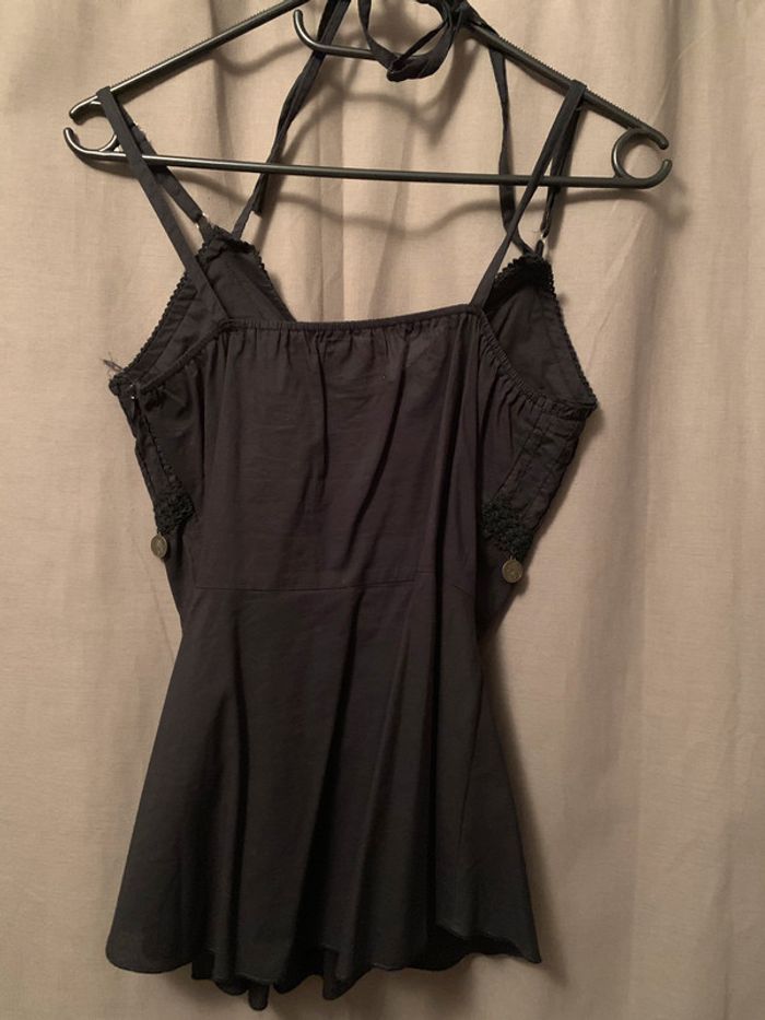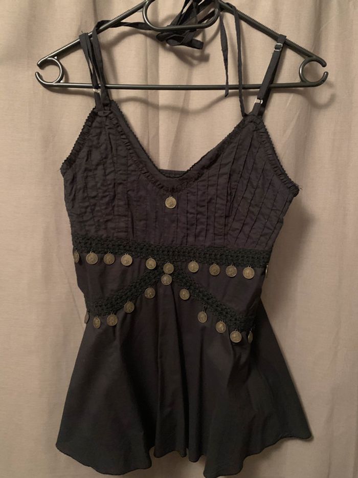 très joli débardeur noir avec petits détails dorés et lien à jouer autour du coup très belle coupe cintrée puis évasée porté 1 fois