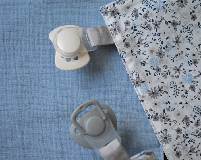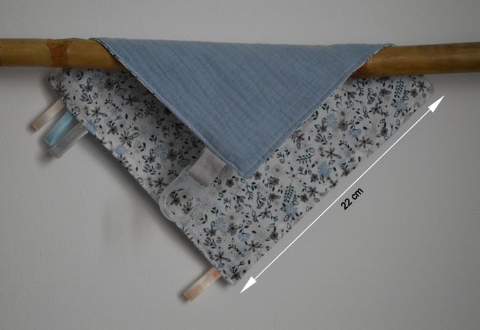 Je vous propose la collection FLORE HIVERNALE. Se sont des confections réalisées par mes soins en petite quantité. Elle comprends 4 pièces: - un sac pochon avec cordons de srrage, il est doublé, il fait 23 par 26 cm, - 2 doudous identiques 22 par 22 cm avec accroche sucette en silicone pour sucette avec ou sans anse (voir photo), - un anneau de dentition "oreille de lapin" en bois non traité. Composition du sac: Tissu imprimé et doublure intérieure gris clair 100% coton, Minky couleur gris foncé 100 % polyester, Passepoil argenté 80 % polyester et 20 % lurex, Cordons 100 % coton. Composition des doudous plats: Tissu imprimé et double gaze bleu ciel 100 % coton, Satin et velours en polyester, Accroche sucette en silicone, trou de 22 mm de diamètre. Composition de l'anneau de dentition: Bois non traité (naturel sans peinture), Tissu imprimé 100% coton, Minky gris foncé 100 % polyester. Photos non contractuelles, dimensions +/- 5 mm.