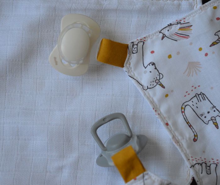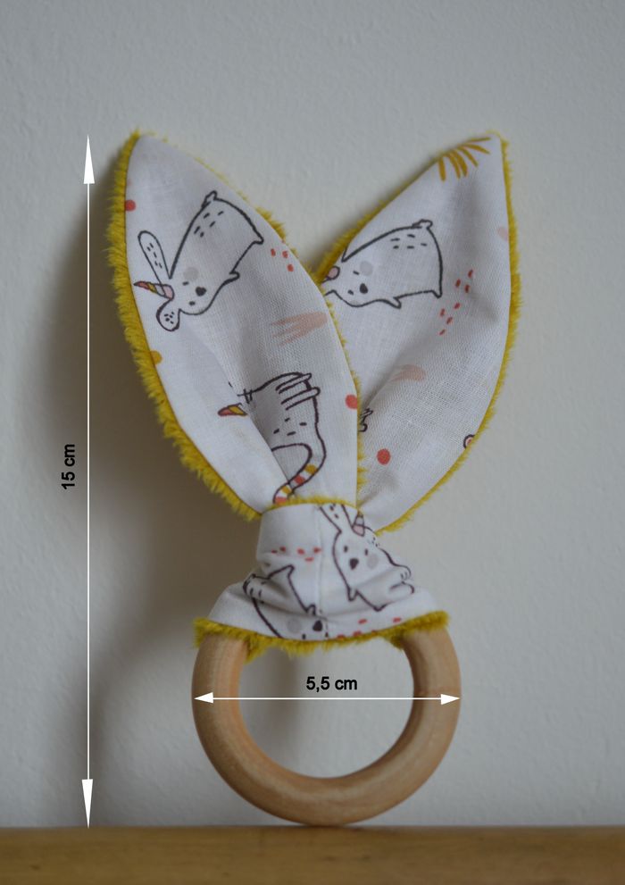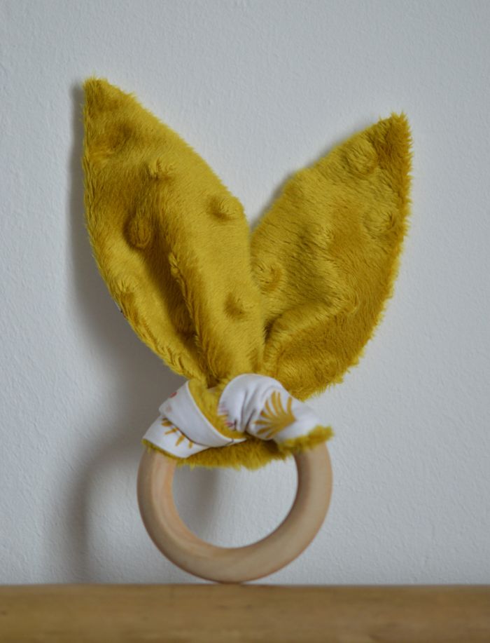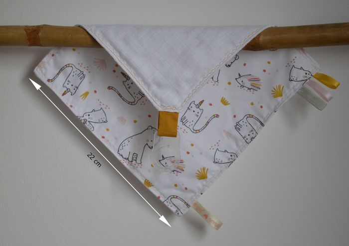 Je vous propose la collection REVES ENCHANTES. Se sont des confections réalisées par mes soins en petite quantité. Elle comprends 4 pièces: - un sac pochon avec cordons de serrage, il est doublé, il fait 23 par 26 cm, - 2 doudous identiques 22 par 22 cm avec accroche sucette en silicone pour sucette avec ou sans anse (voir photo), - un anneau de dentition "oreille de lapin" en bois non traité. Composition du sac: Tissu imprimé et doublure intérieure moutarde 100% coton, Minky ocre 100 % polyester, Passepoil doré 80 % polyester et 20 % lurex, Cordons 100 % coton. Composition des doudous plats: Tissu imprimé et lange blanc 100 % coton bio, Satin et velours en polyester, Accroche sucette en silicone, trou de 22 mm de diamètre. Composition de l'anneau de dentition: Bois non traité (naturel sans peinture), Tissu imprimé 100% coton, Minky ocre 100 % polyester. Dans la même collection vous pouvez acheter la pochette carnet de santé, les frais de port ne seront pas compter en sus. Photos non contractuelles, dimensions +/- 5 mm.