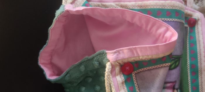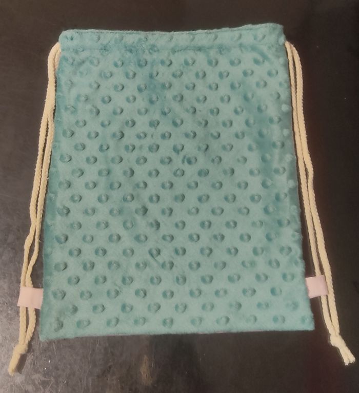 Sac pochon avec cordons de serrage. Dimensions: 26 cm de large et 33 cm de haut. Un coté en coton imprimé, l'autre en minky vert a pois. Une doublure rose en coton. J'ai mis un aperçu avec une pochette A4 pour mieux se rendre compte des dimensions.
