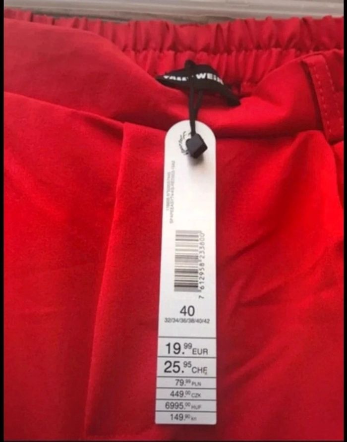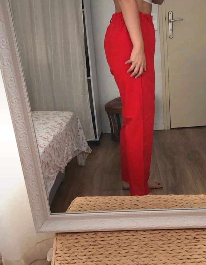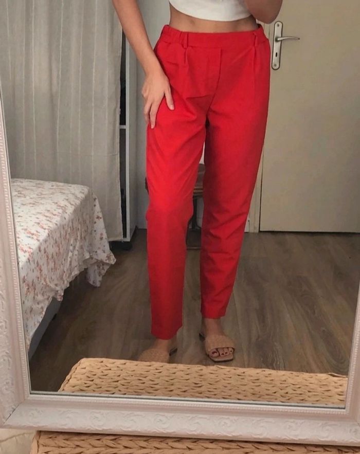 Pantalon neuf avec étiquette, porté juste pour la photo, rouge, taille 40, marque Tally Weijl. Les poches arrières sont fausses, il n’y a pas de fermeture éclair. Coupe plutôt serrée sur le bas Taille correctement