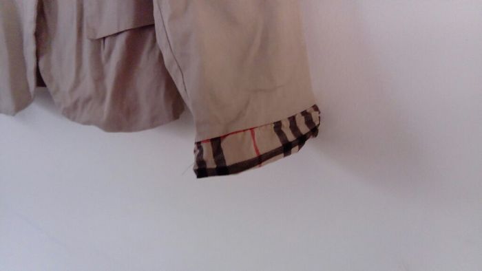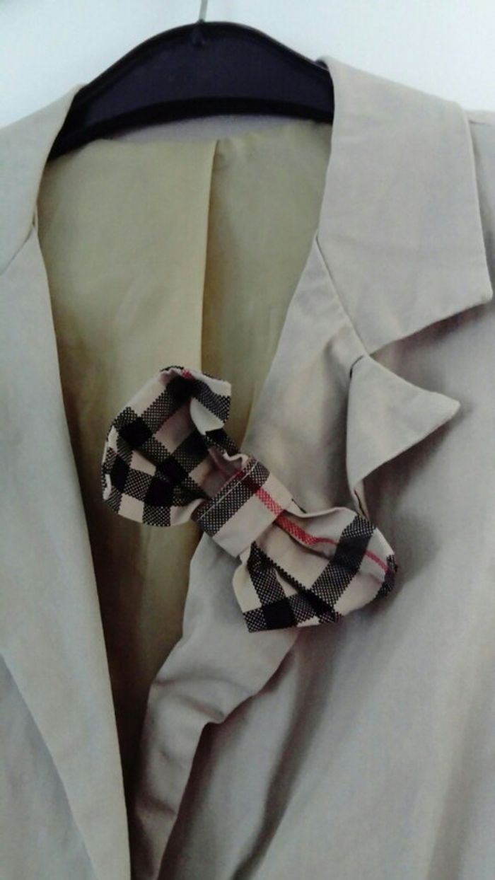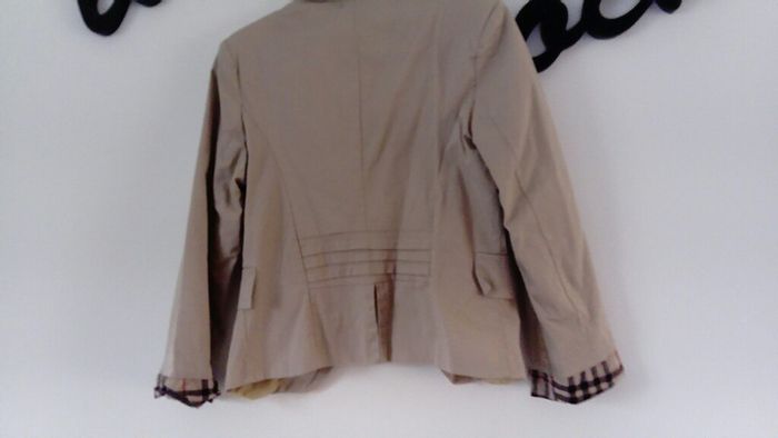 Veste cintrée, petit noeud à l encolure, revers des manches rayé noir et rouge, fausses poches.