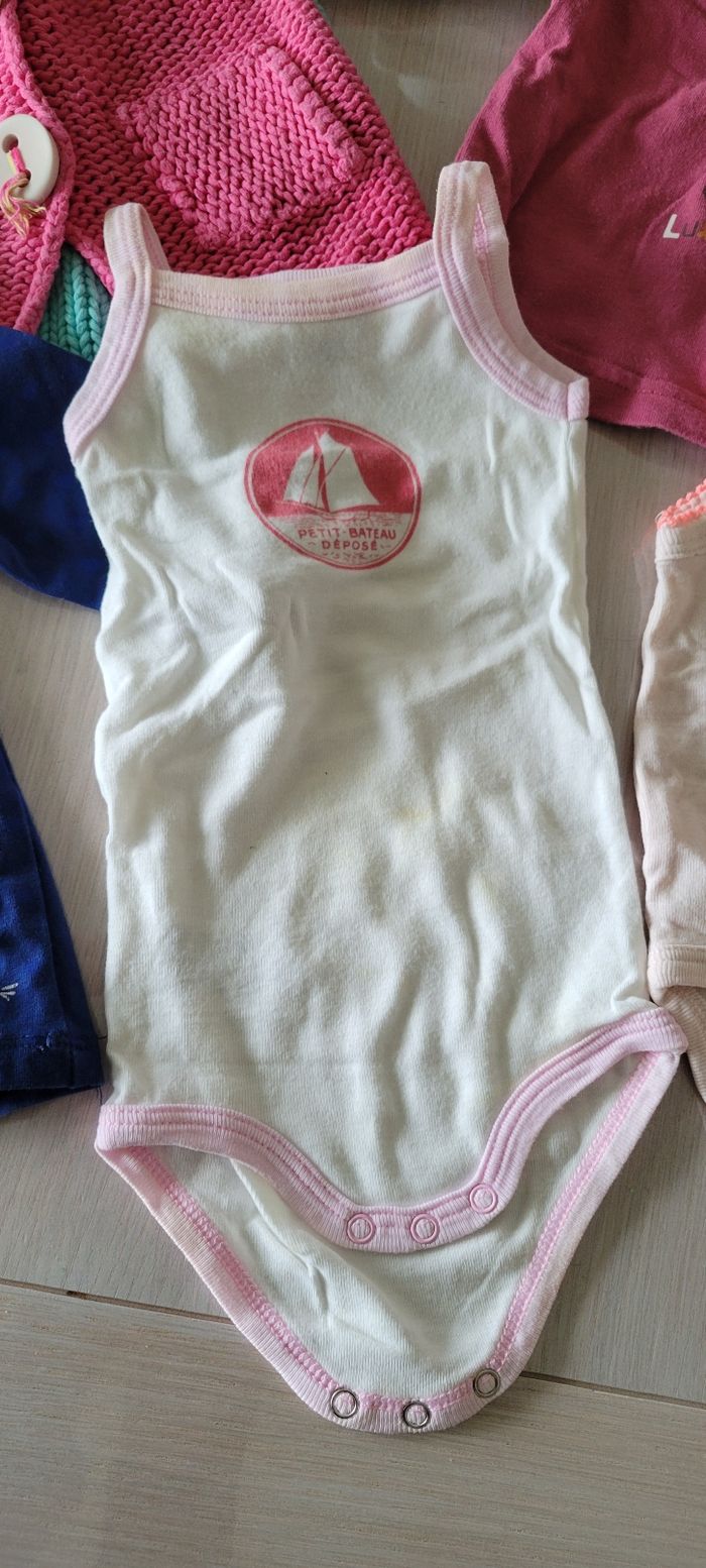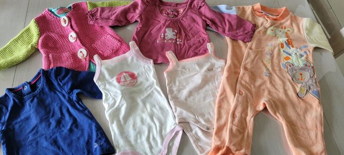 Lot vêtements fille: - 1 tee shirt manches longues bleu marine Orchestra - 1 tee shirt manches longues rose Lulu Castagnette - 1 veste rose/anis/bleu Du Pareil au même -2 bodys à bretelles Petit Bateau - 1 pyjama corail Les Chatounets. Taille 3 mois Très bon état #33coco_fille3mois #33coco_lot