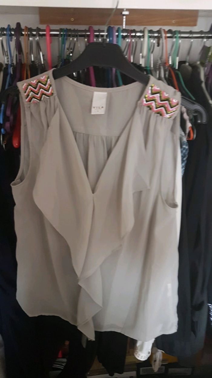 Top gris à volant perles colorées sur les épaules