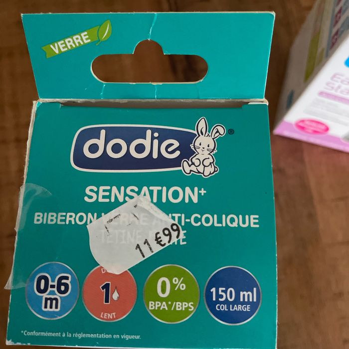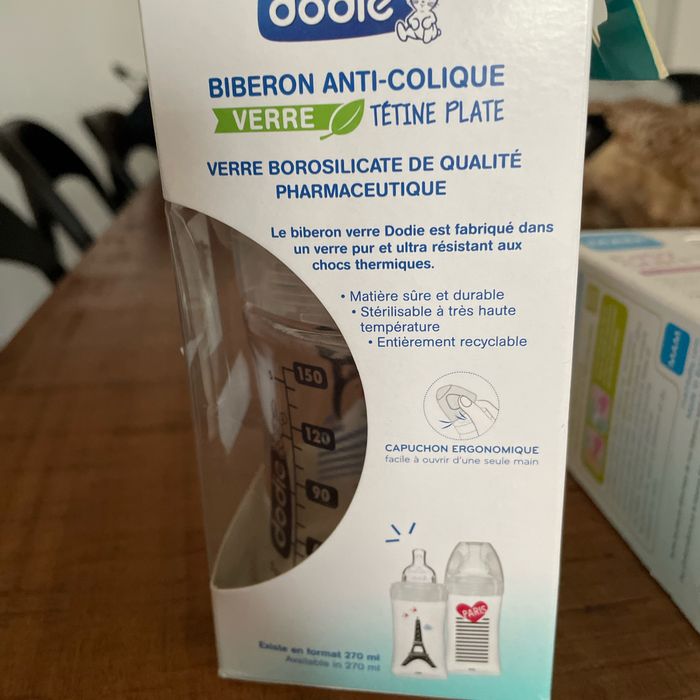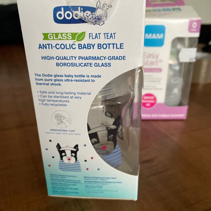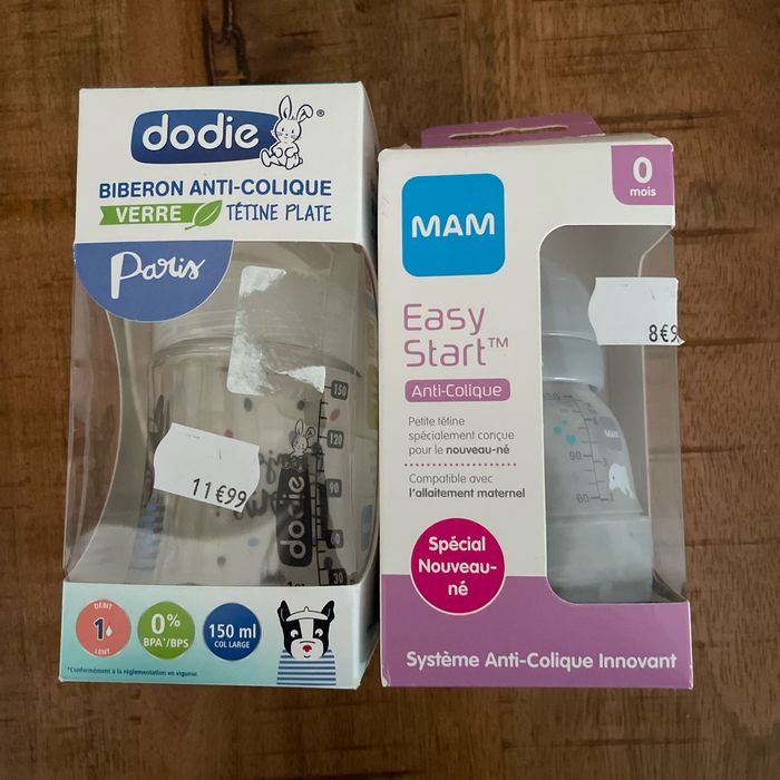 Neufs 2 biberons 🍼 un en verre le dodie décorer d’un petit bouledogue français avec un béret et une marinière Le deuxième biberon de mam en plastique 0% de BPA-BPS gris clair