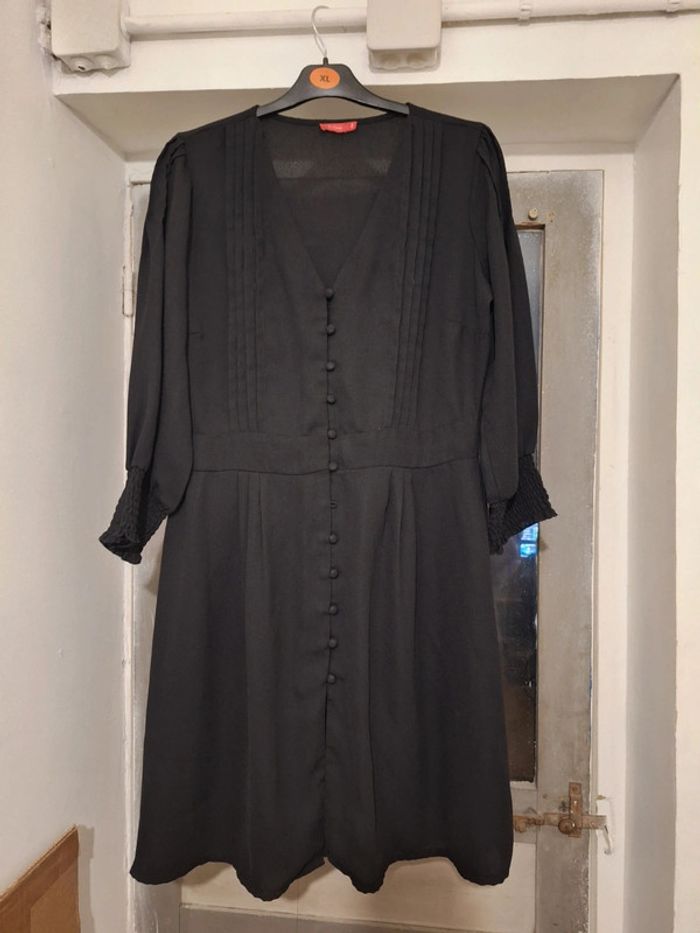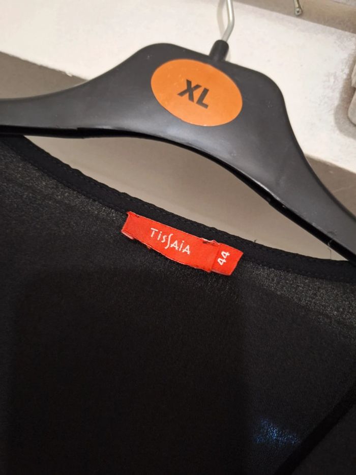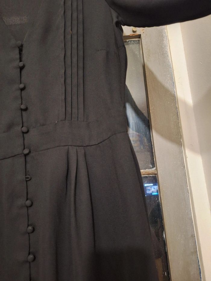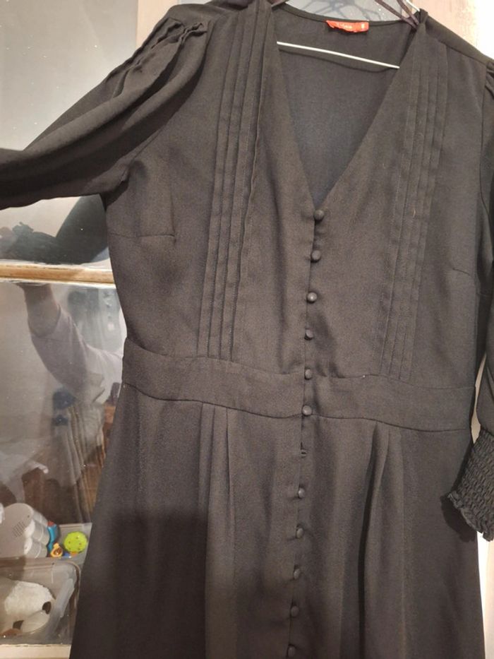 Robe noire t44 Tissaïa arrive au dessus des genoux. Convient à un T40/42. Très bon état. Il manque juste un bouton en plein milieu de la robe (voir photo)
