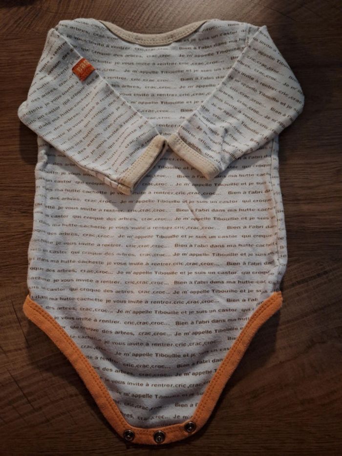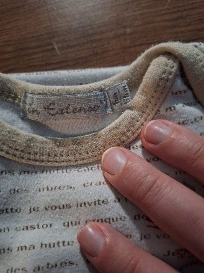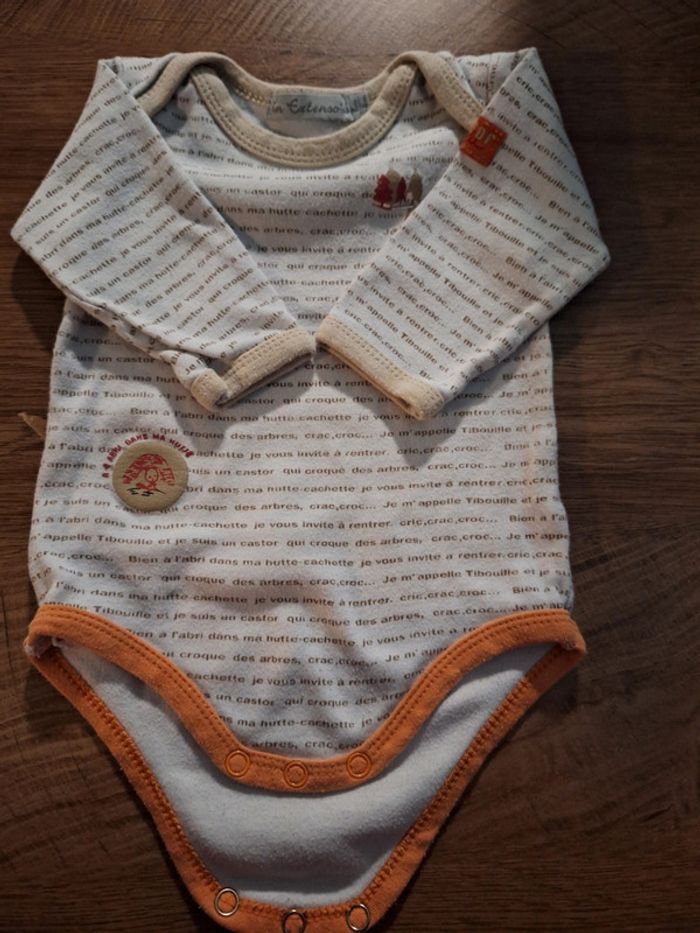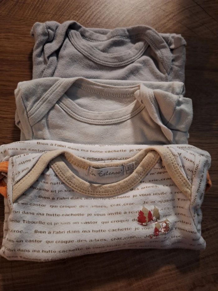 Bodys 6 mois. Il y en a un seul qui est de marque In Extenso. Les 2 autres je n'en sais rien, l'étiquette à été coupée.