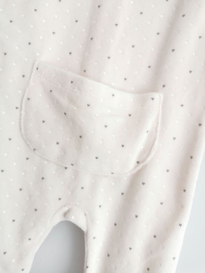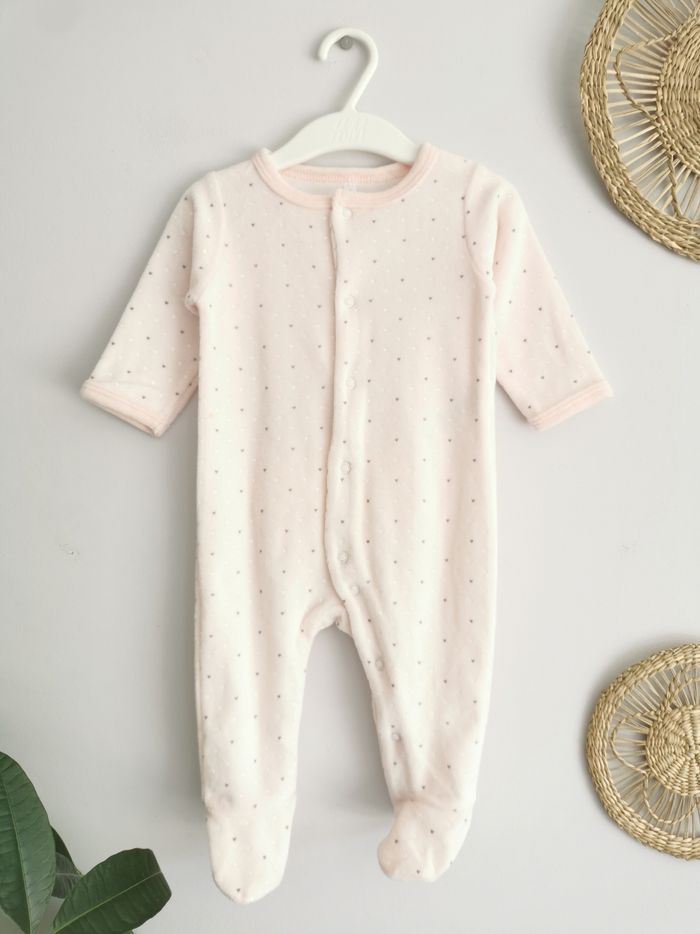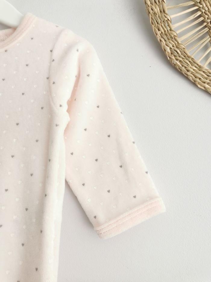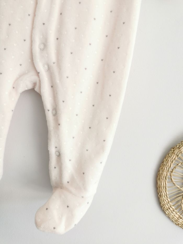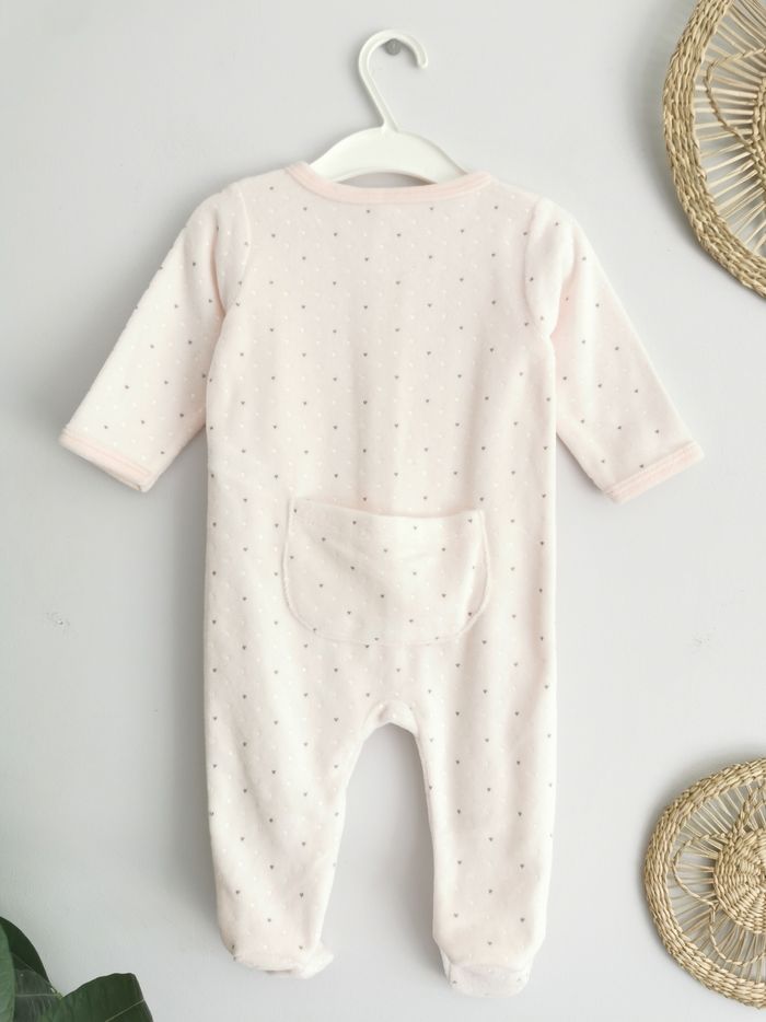 🧒 Pyjama velours ➕ bonnet ➕ moufles 🧒 Tex 🖊️ ÉTAT ✅️: Parfait👌- Jamais porté 🆕 🖊️ DESCRIPTION: ▪️Taille 6 Mois ▪️Matière: 76% coton - 24% polyester ▪️Tissu Velours tout doux ▪️Ouverture par boutons pression à l'avant ▪️Poche decorative à l'arrière ▪️Motifs: Petits cœurs gris et blanc 🤍🤍🤍 ▪️Couleur: Rose pâle 💙