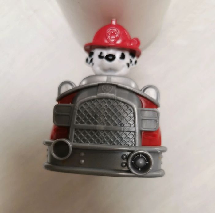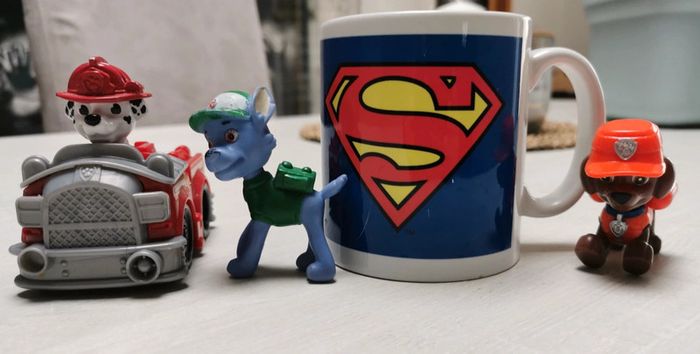 Zuma (x2) , Chase, Marcus et Rocky + bracelet avec Pat'Patrouille et son médaillon 2 visages (Chase et Marcus). La photo avec la tasse Superman est juste faite pour préciser la taille des figurines. Marcus avec sa voiture ne font qu'un. Le personnage n est pas mobile. Chase avec sa voiture ne font qu'un. Le personnage n est pas mobile