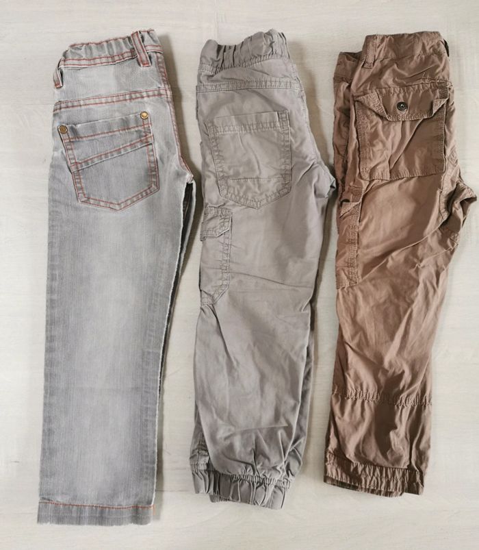 Lot de 3 pantalons 1 jean, gris clair, 3 Suisses Collection : bon état. Quelques traces niveau genou et usures niveau boutons poches arrière. 1 pantalon marron clair, mi-saison, Vertbaudet : RAS. 4 poches. 4 avants, 2 arrières. 1 pantalon gris clair, Kiabi : quelques taches niveau genou, et 1 côté recousu. Toutes les photos présentant les défauts sont postées.